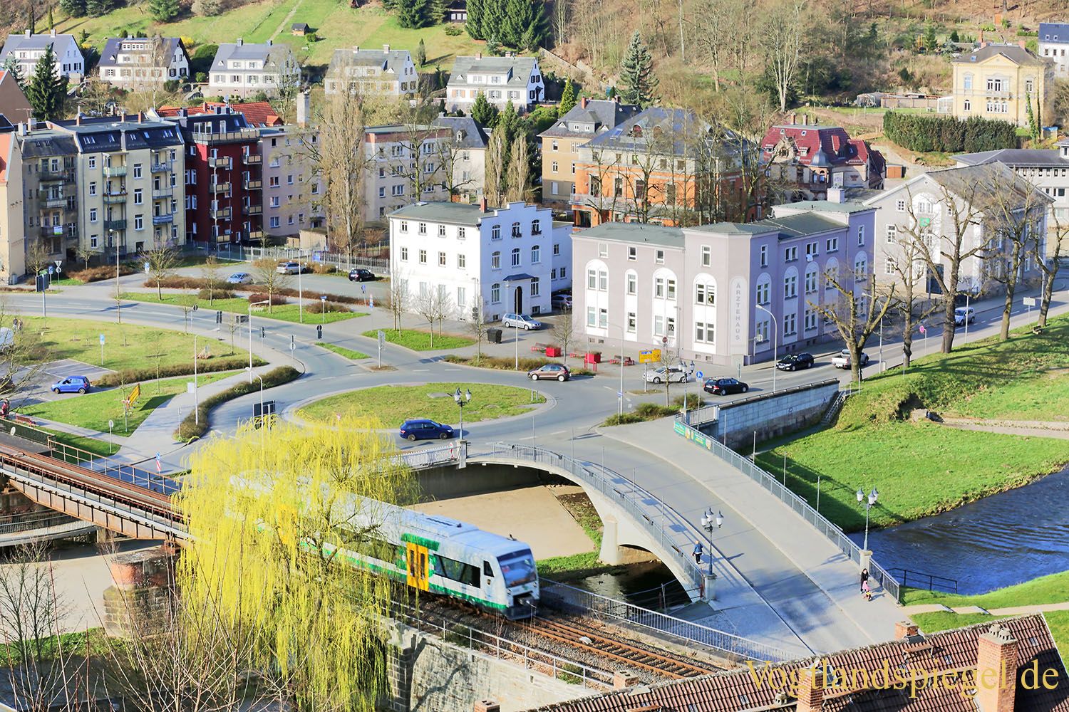 Die Vogtlandbahn fährt in Richtung Schlossbergtunnel. Aufnahme vom 1. April 2017.