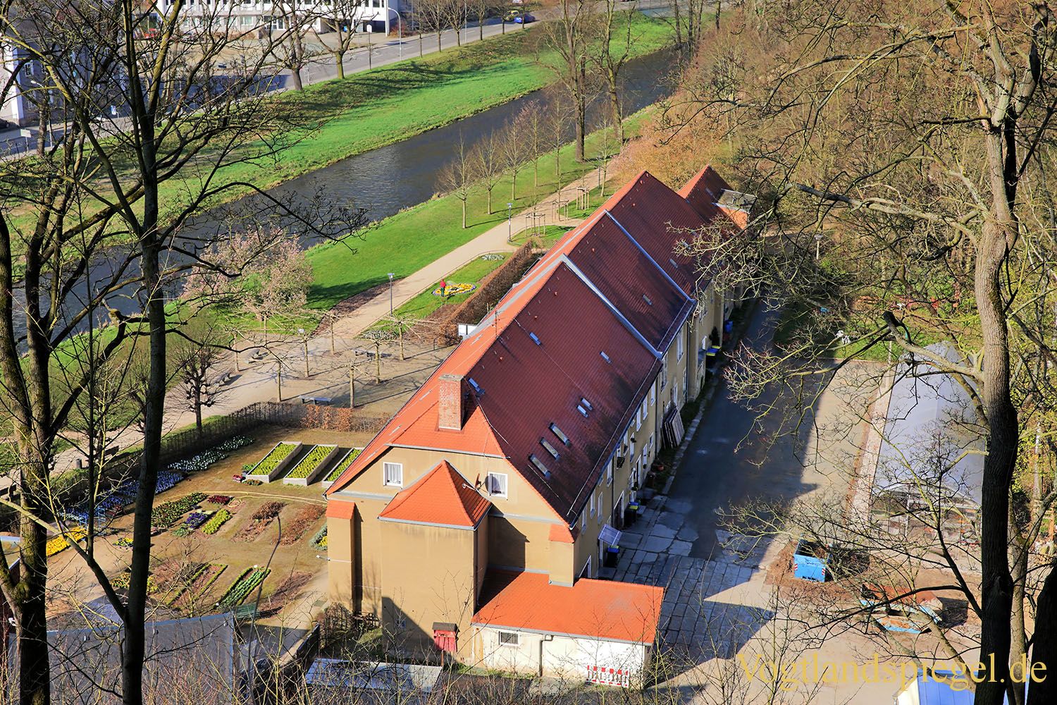 Die Häuser am Eingang zum Fürstlich Greizer Park. Aufnahme vom 1. April 2017.