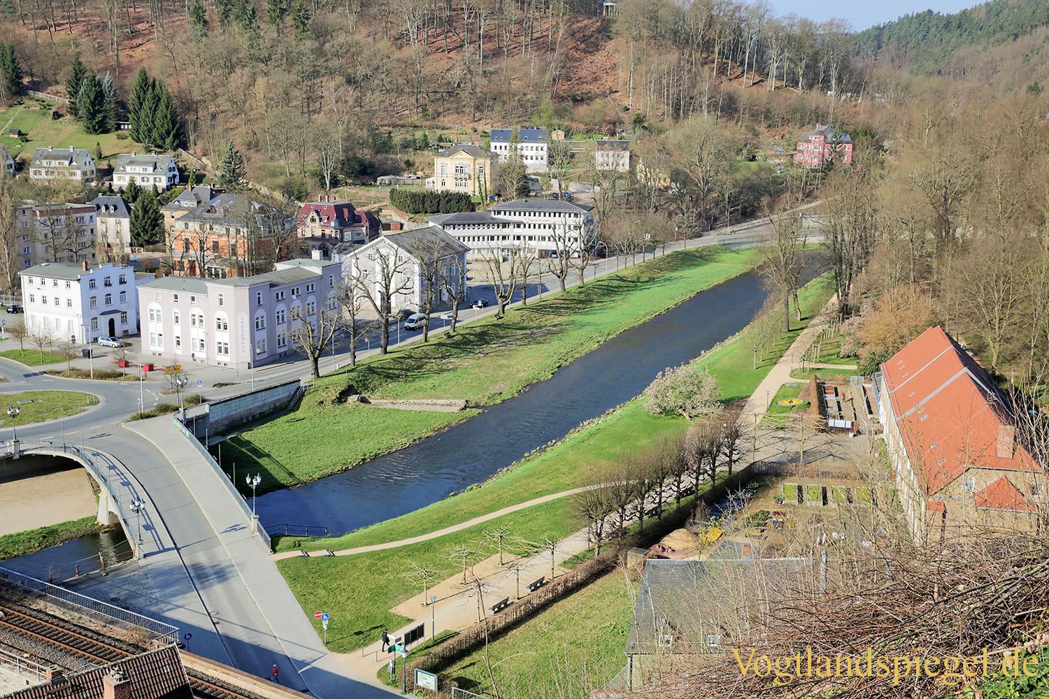 Blick vom Oberen Schloss elsterabwärts. Aufnahme vom 1. April 2017.