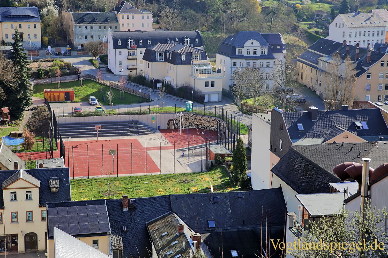 Blick vom Schloss auf die Spiel-und Freizeitanlage in der Marienstraße. Aufnahme vom 1. April 2017.
