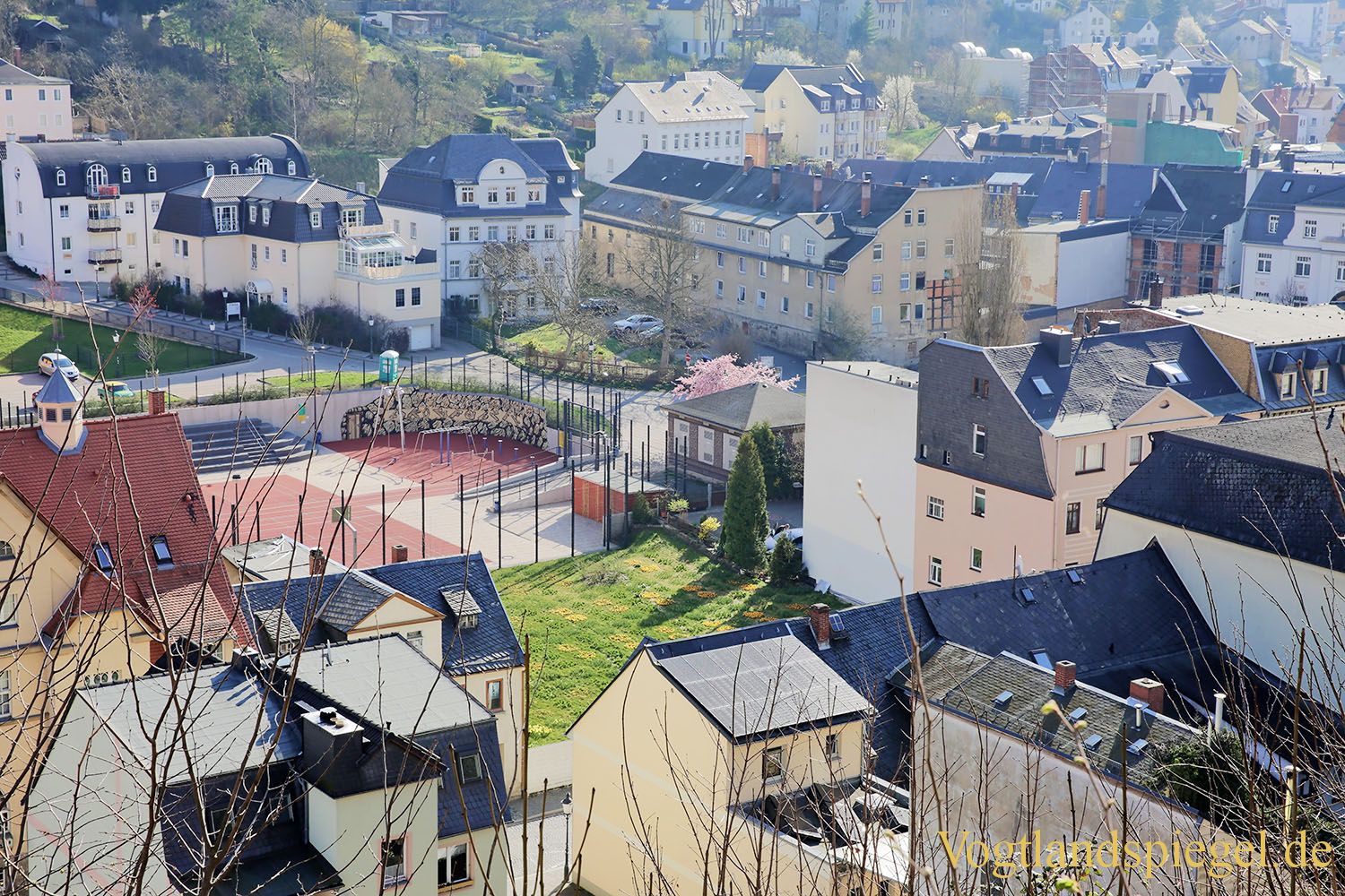 Blick vom Oberen Schloss auf die Spiel-und Freizeitfläche in der Greizer Marienstraße. Aufnahme vom 1. April 2017.