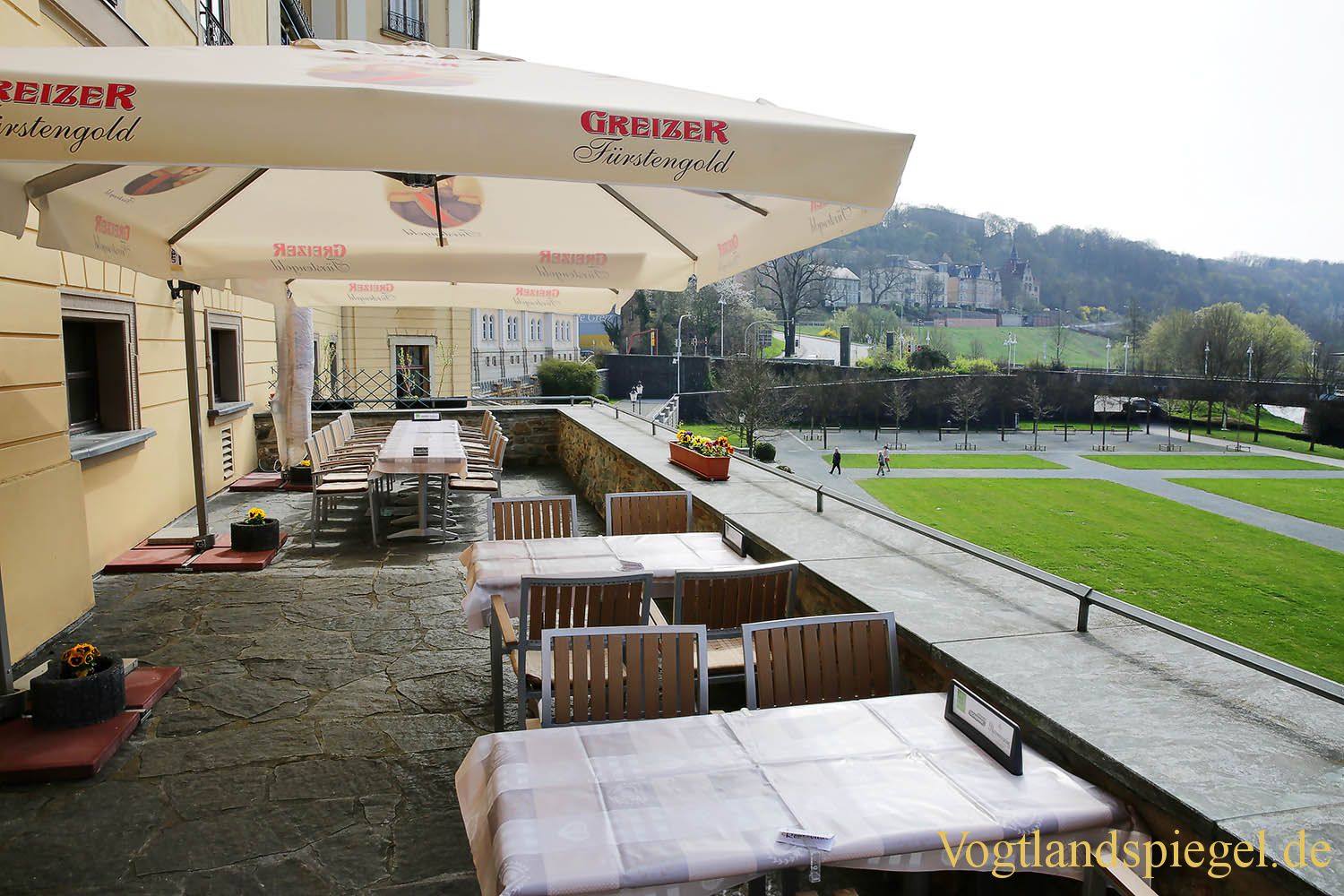 Auf der Terrasse des Restaurants „Harmonie“ – Blick in den Schlossgarten. Aufnahme von Anfang April 2017.