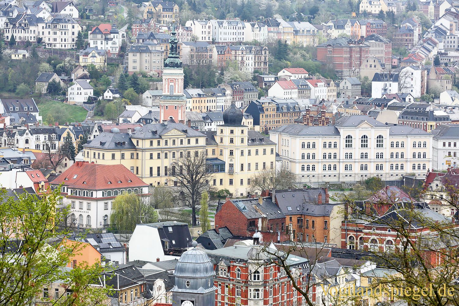 Blick vom Tempelwald auf die Stadt Greiz. Aufnahme von Mitte April 2017.