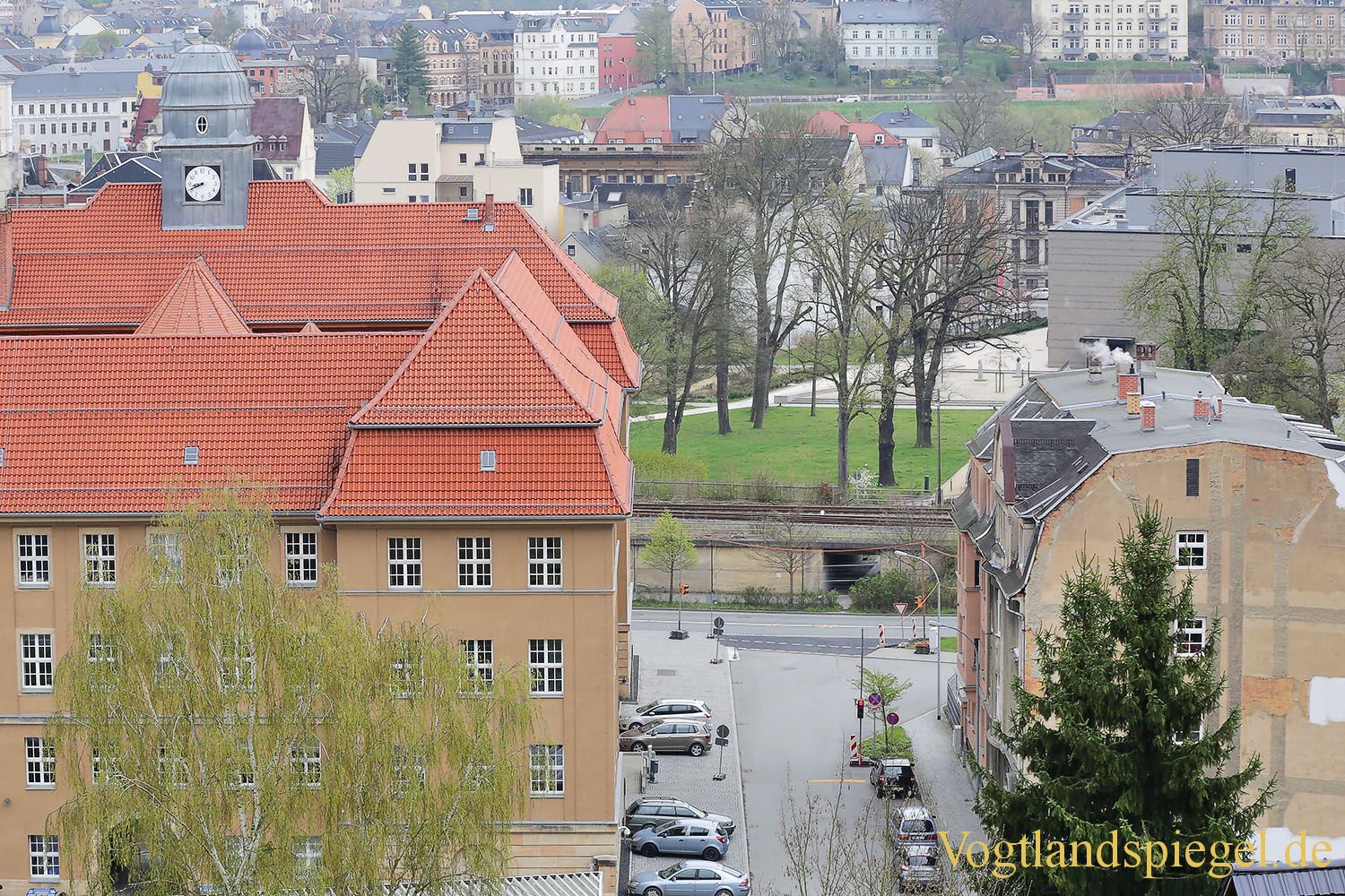 Blick durch die Straße Am Tempelwald und das Justizgebäude auf den Goethepark. Aufnahme von Mitte April 2017.