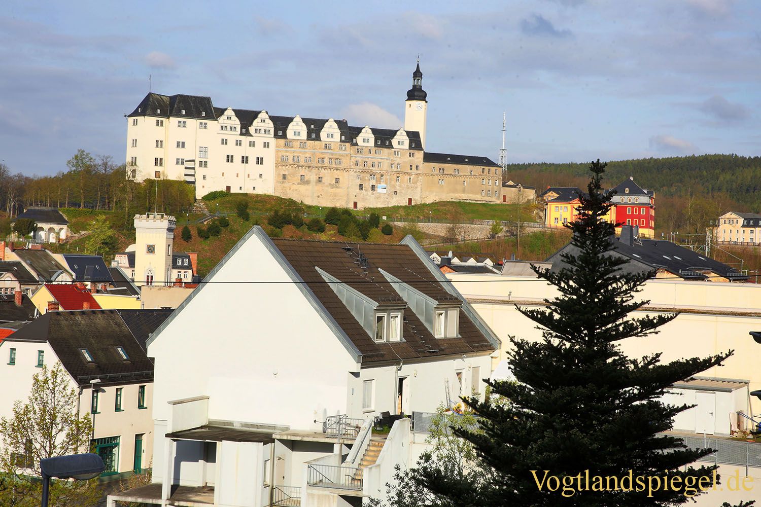 Blick über die Dächer zum Oberen Schloss Greiz. Aufnahme von Mitte April 2017.