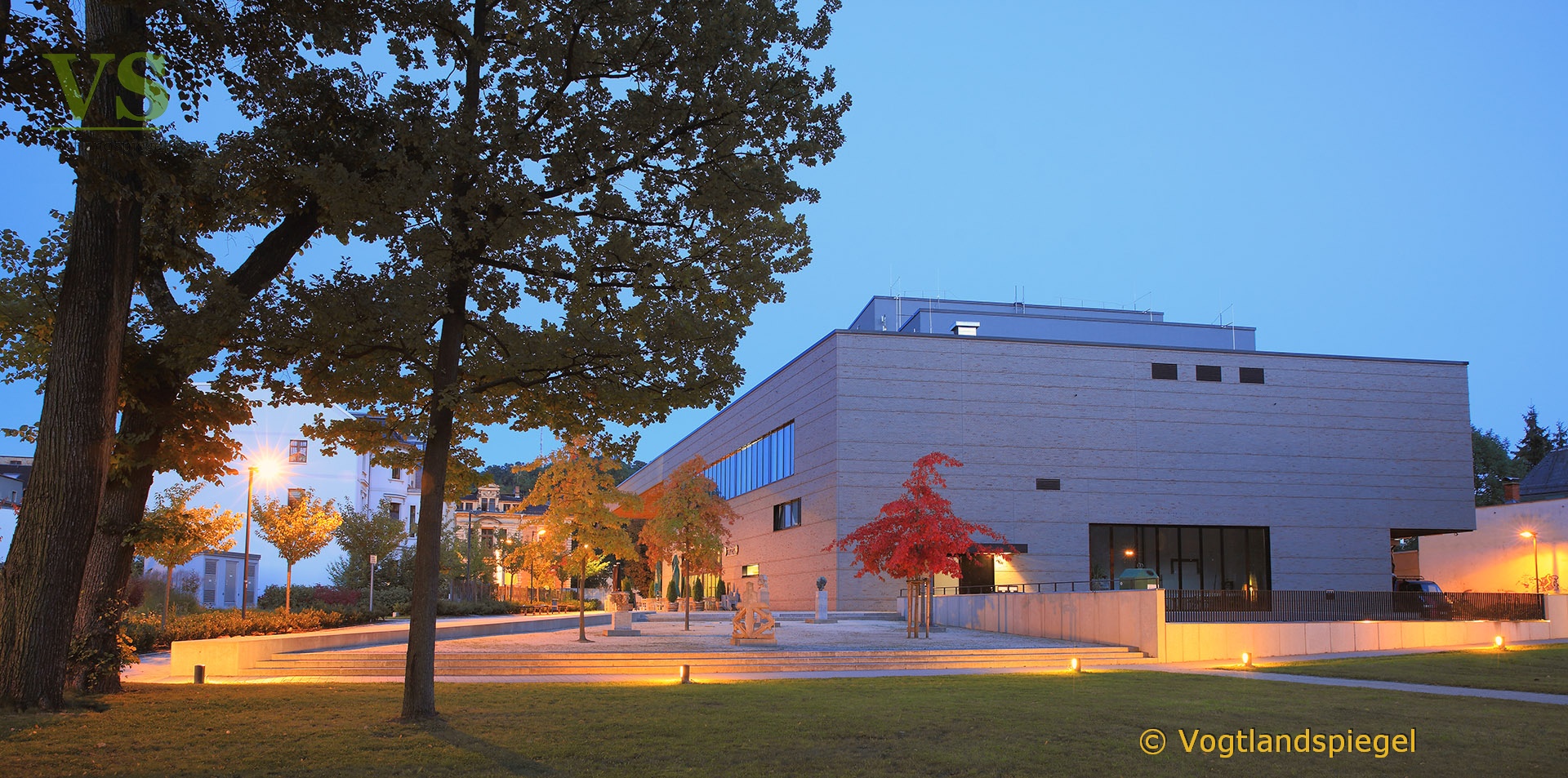 Die Vogtlandhalle Greiz im abendlichen Schein.