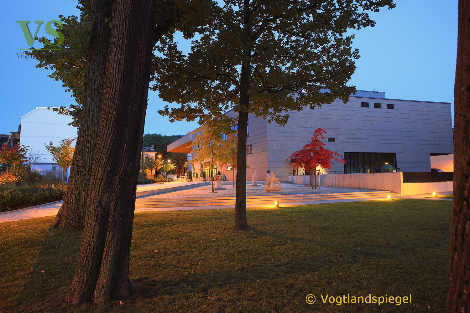 Blick durch die Bäume des Goetheparks zur Vogtlandhalle Greiz.