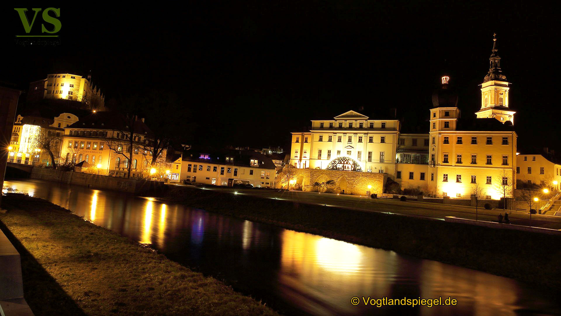 Blick über die Weiße Elster auf das klassizistische Ensemble, die Stadtmühle, Sparkasse und Oberes Schloss. Aufnahme vom 23. Dezember 2017.