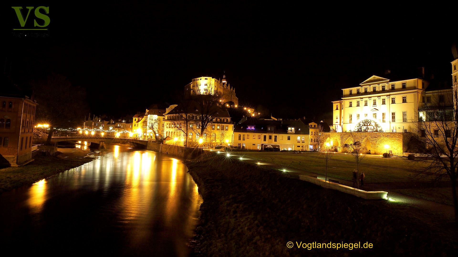 Blick elsterabnwärts in den Schlossgarten samt klassizistischem Ensemble, Stadtmühle, Sparkasse, Friedensbrücke und Oberem Schloss. Aufnahme vom 23. Dezember 2017.