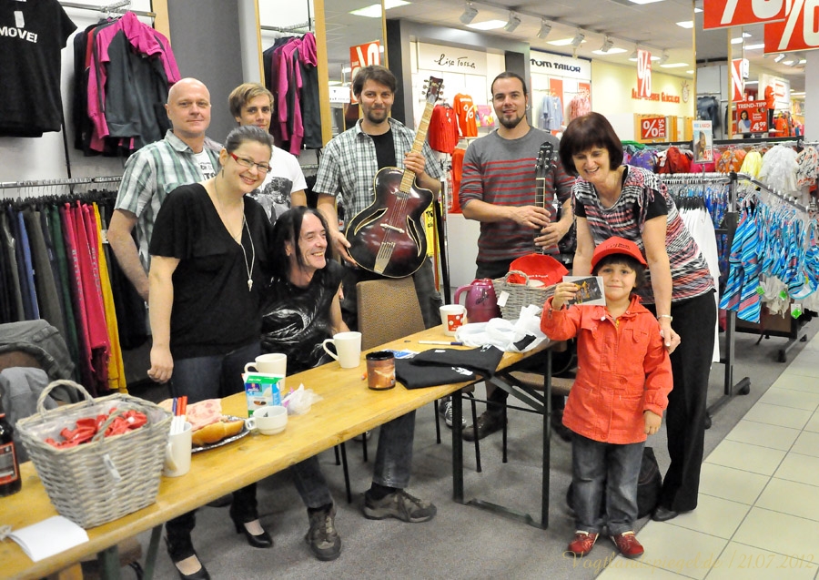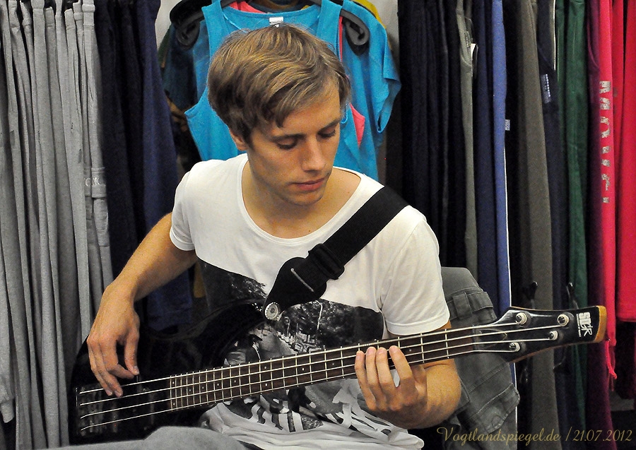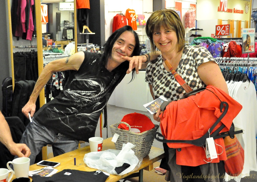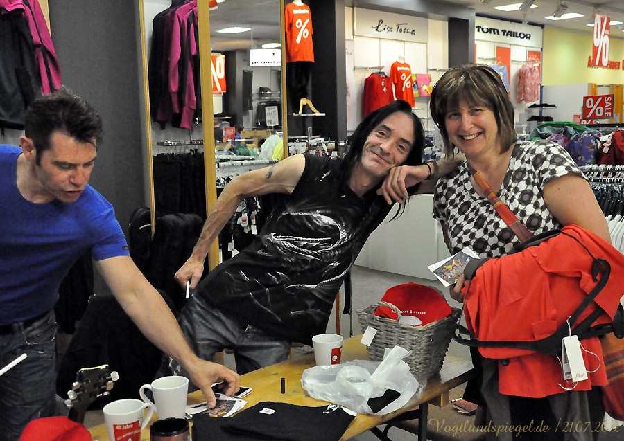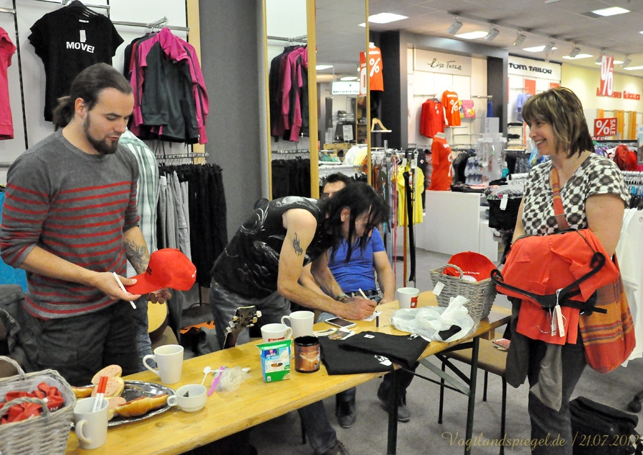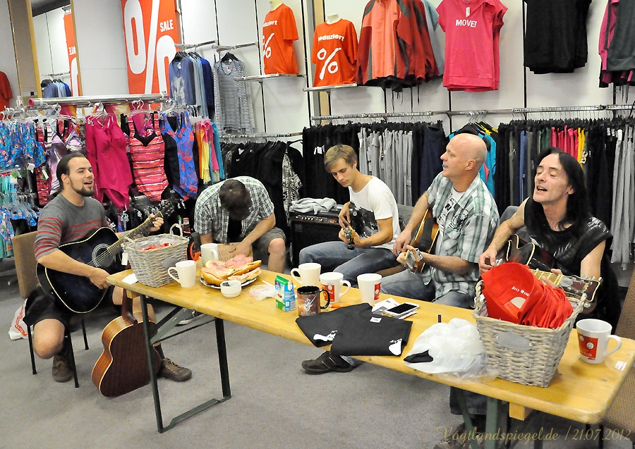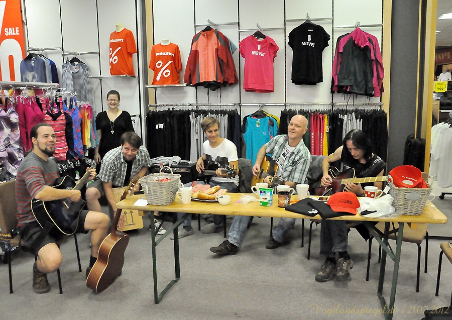 Musiker der Band „Rockwoolf“ mit entspannter Session im AWG-Modecenter Greiz Autogramme schreiben war angesagt bei der Band RockwolfGREIZ. Man kennt sie von zahlreichen Auftritten im Vogtland: die Coverrockband Rockwoolf. Am Sonnabend konnte man die Jungs auch im AWG Modecenter erleben. Neben ihren Instrumenten hatten die Musiker auch Autogrammpostkarten, T-Shirts, Luftballons und Caps mitgebracht. Initiatorin dieser Autogrammstunde mit Musik war Isabell Kvarik, seit zweieinhalb Jahren 1. Stellvertretende Filialleiterin, die mit dieser besonderen Aktion dazu beitragen wollte, das AWG-Modecenter gerade in der schwierigen Zeit des Ausbaus der August-Bebel-Straße in den Fokus des Kundeninteresses zu rücken. Ich habe „Rockwoolf“ schon einige Male gehört und finde sie einfach Klasse, gestand die junge Frau, die als Managerin schon im Disneyland und einem Fünf-Sterne-Hotel in Paris tätig war und die die Liebe nach Greiz verschlug. Eine mutige Mail an Roy und schon sei die spontane Zusage der Band gekommen, wie Isabell Kvarik berichtete. Als die Musiker dann in die Saiten griffen und Rockin“ in the free world oder Knockin“ on heavens door spielten, wurde das Unplugged-Konzert zum Event, das von spontanem Beifall von Passanten und Kunden begleitet wurde. In gemütlicher Runde eine entspannte Session zu geben, hatte sich Gitarrist und Sänger Daniel Kertscher vorgenommen, wobei ihm die Bandkollegen Chriss Schmidt, Christian Schiller, Roy Schulze, Holger Reiter und Alexander Trommer einhellig zustimmten. Das erste Autogramm des Vormittags ließ sich die vierjährige Emely geben, die stolz verriet, dass ihr Papa auch Musik macht. Antje-Gesine Marsch @21.07.2012