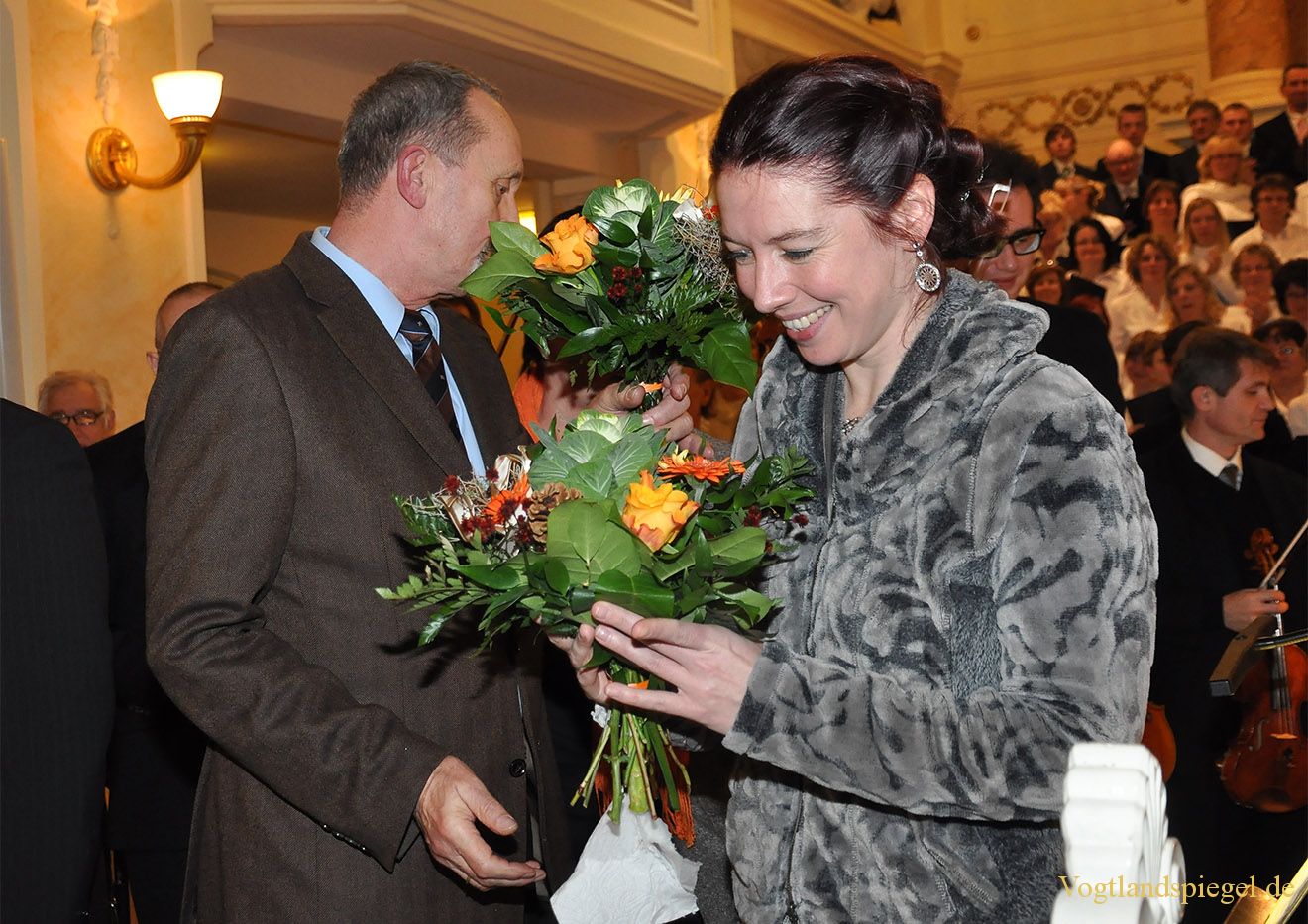 Sopranistin Christina Roterberg freut sich über die Blumen.