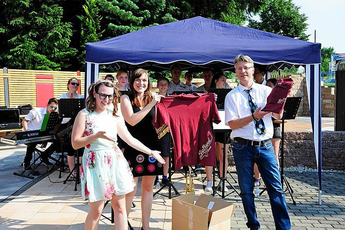 Jana Haucke (M.) und Lisa Hertel überreichen BigBand-Chef Matthias Härtig die Polo-Shirts.