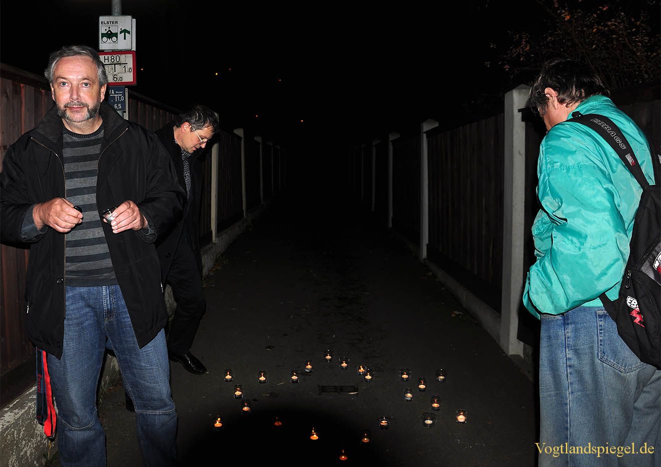 An den Stolpersteinen auf dem Greizer Gartenweg wurde mittels Kerzen ein Davidstern gebaut.