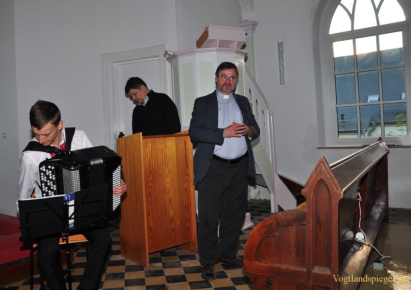 Der Pfarrer der SELK, Harald Karpe (r.) weist auf die anderen drei Konzerte der ukrainischen Künstler in Plauen hin.