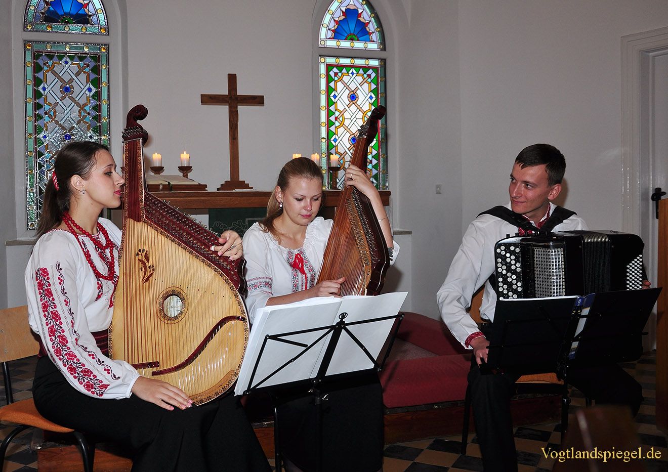 v.l. Mariana, Maria und Roman sind das Ensemble „Beriska“ aus Kiew.