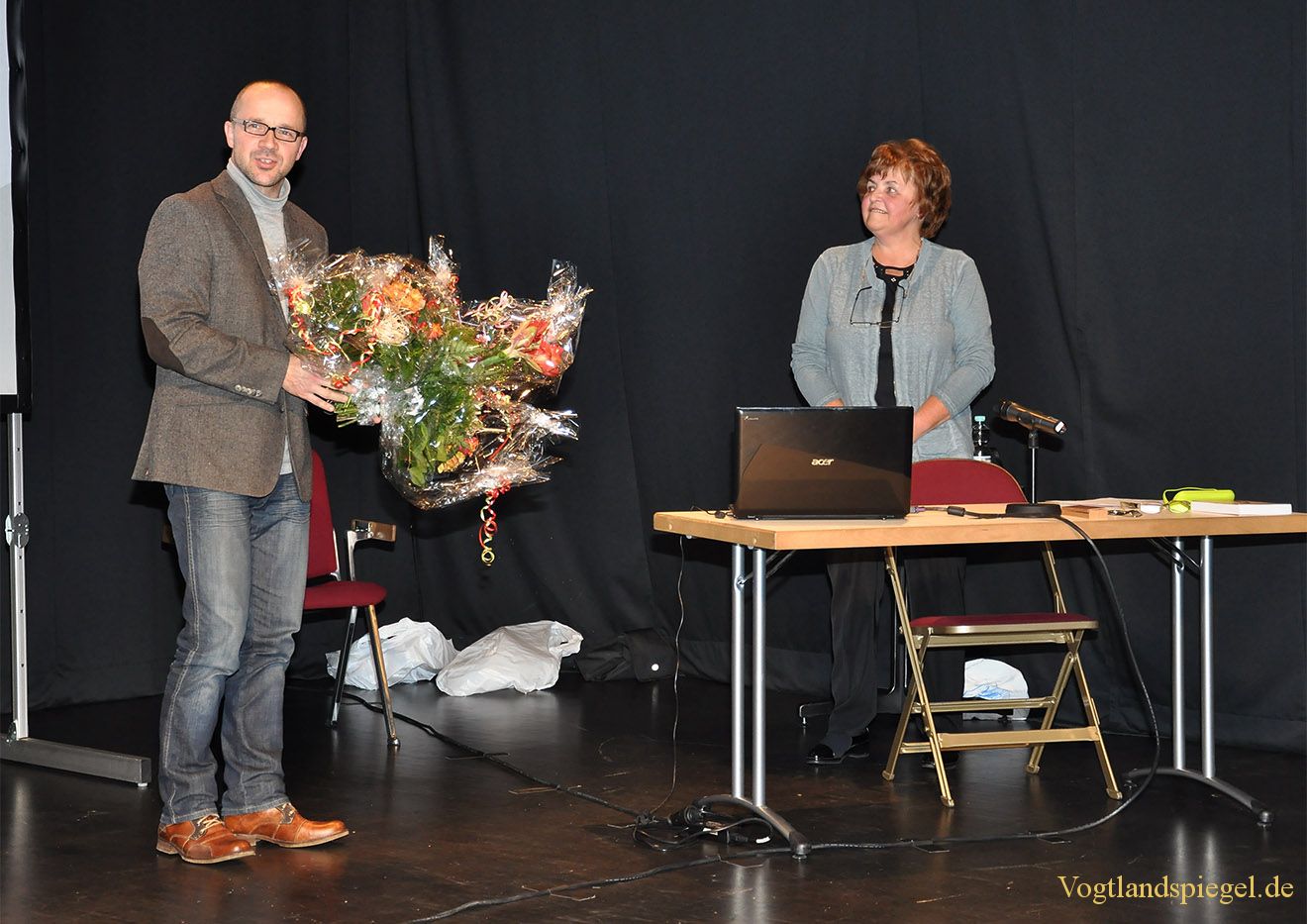 Musikschulleiter Ingo Hufenbach überreicht Brigitte Buchholz einen Blumenstrauß.