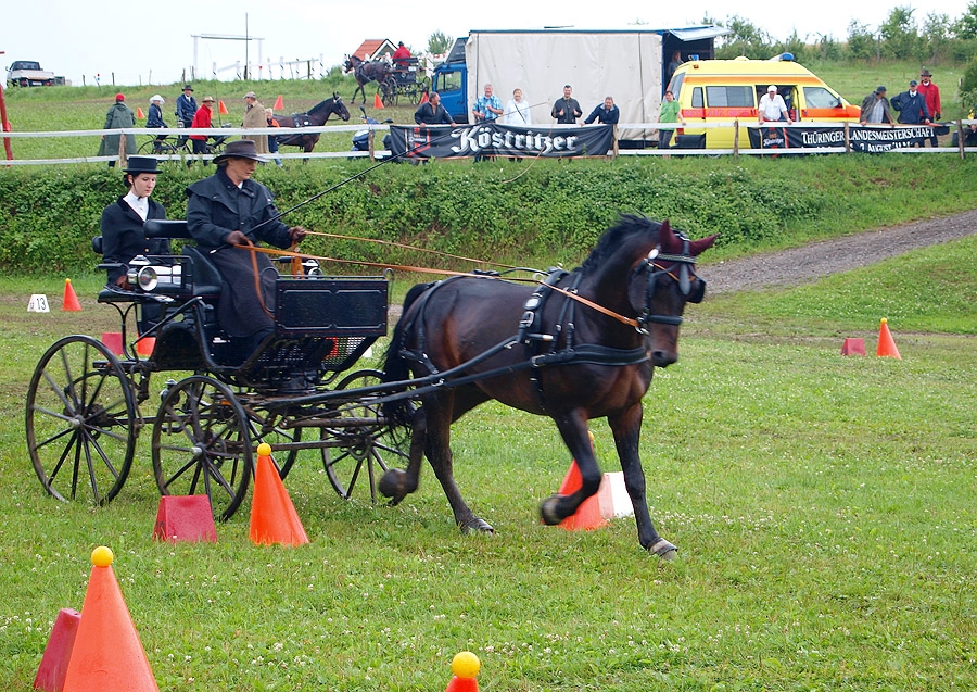 Rasanz und Eleganz des Gespanns, gepaart mit dem Können von Bettina Winkler viele der Kenner der Szene prophezeiten, dass da nichts schief gehen könne. Tolle Leistungen in den drei Einzeldisziplinen (Dressurfahren, Strecken- und Geländefahrt, Hindernisfahren durch den Kegelparcours) summierten sich zum Titelgewinn des Thüringer Landesmeisters im Zweispännerfahren Großpferd. Schon wieder ein Titel in der Sammlung von Bettina Winkler, die in Warendorf beim Bundeschampionat der Einspänner mit Royal Speed so groß aufgetrumpft hatte.