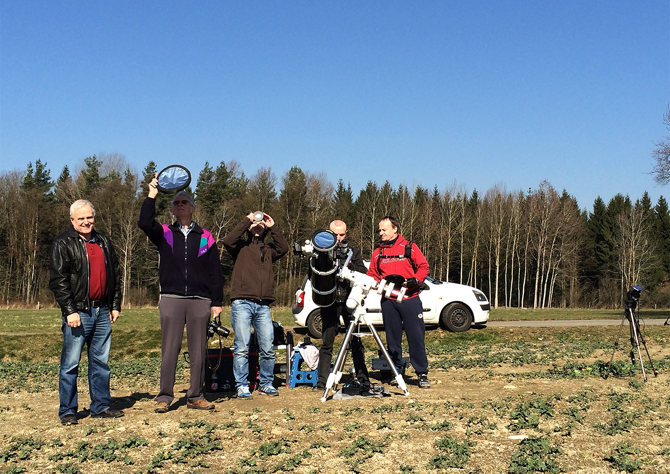 Interessierte verfolgen die Sonnenfinsternis auf einem Feld bei Mohlsdorf.