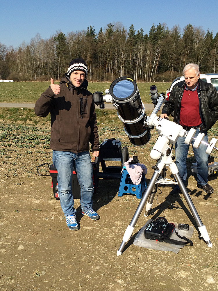 Tobias Elster (l.) hat sein Teleskop aufgebaut.