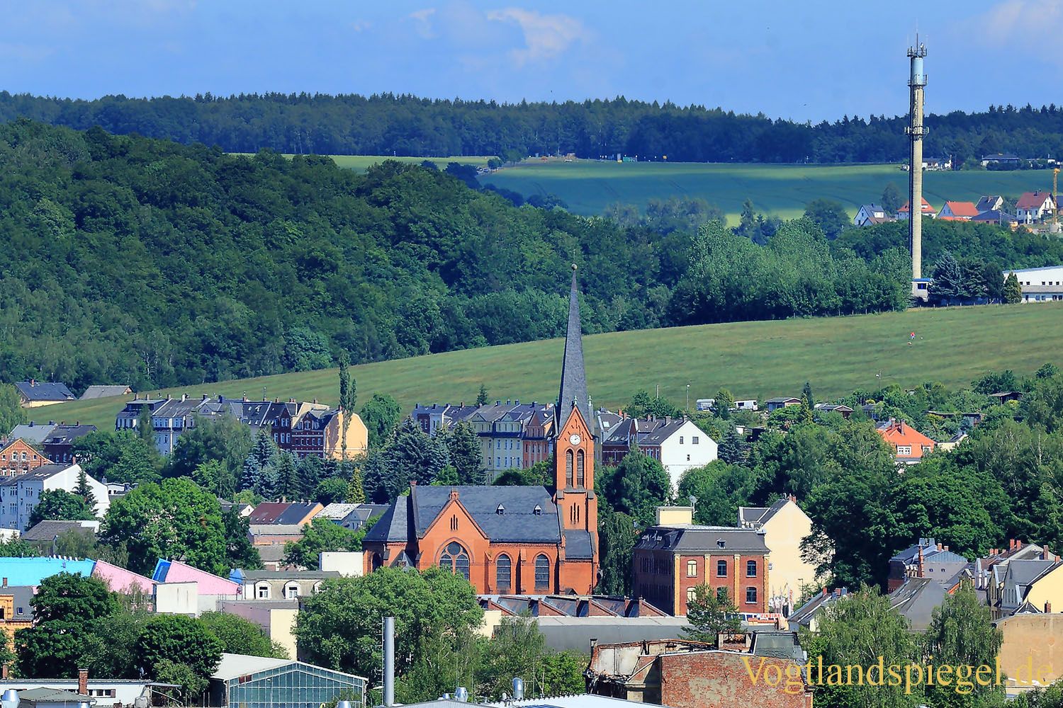 Blick aus der luftigen Höhe des Krankorbs auf die Stadt Greiz
