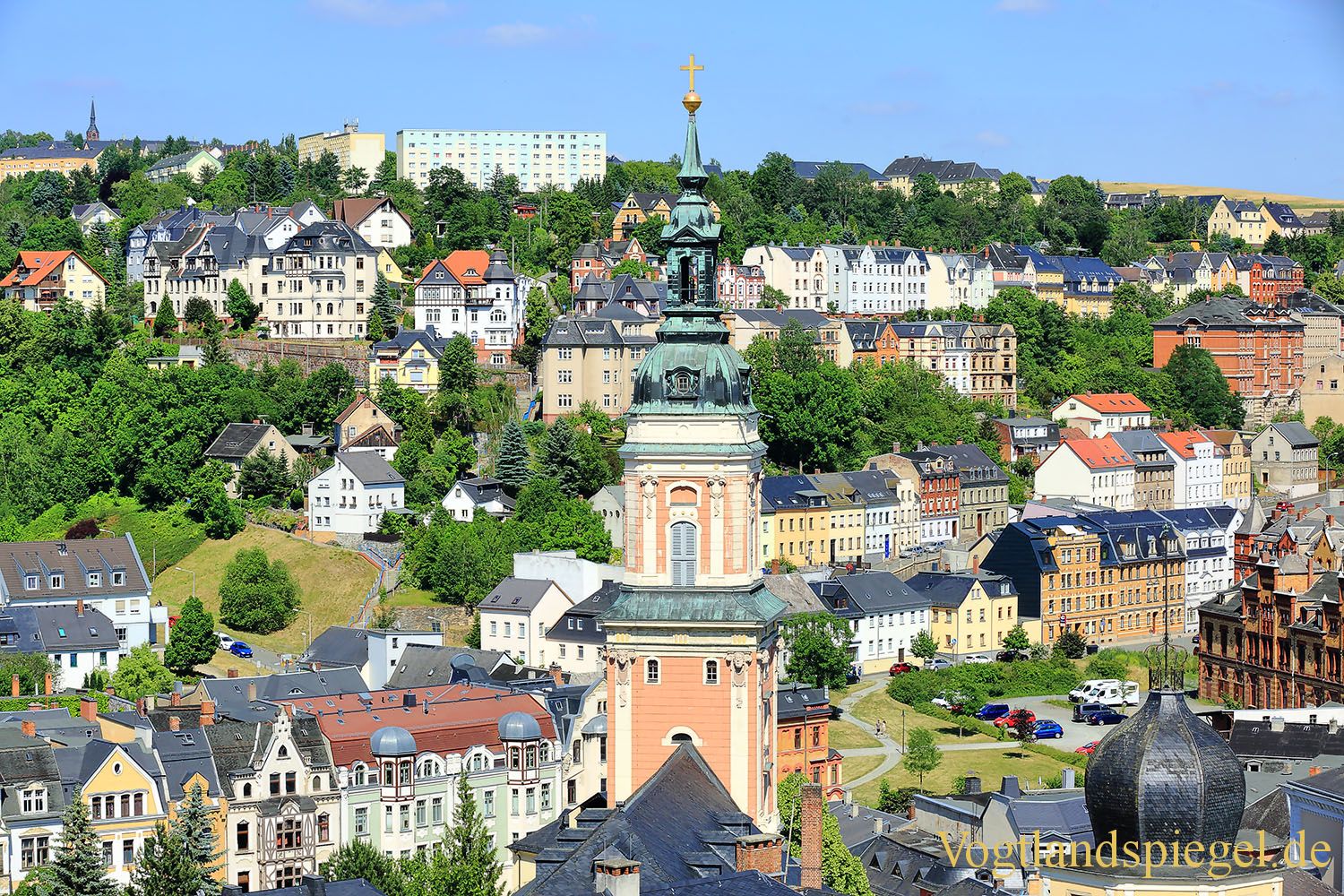 Blick aus der luftigen Höhe des Krankorbs auf die Stadt Greiz