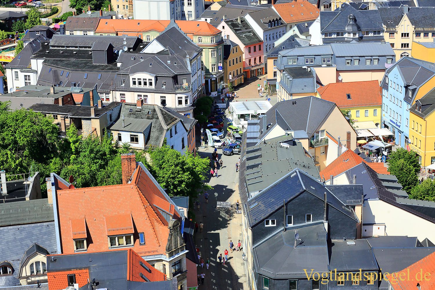 Blick aus der luftigen Höhe des Krankorbs auf die Stadt Greiz