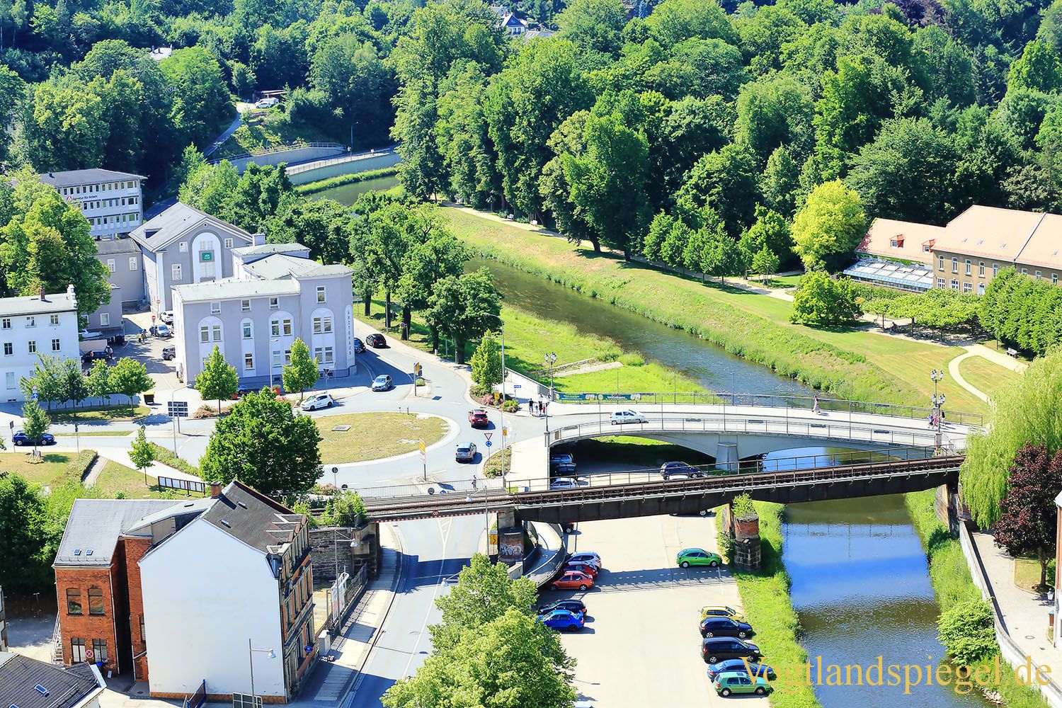 Blick vom Kran in Richtung Neustadtkreisel, Ärztehaus und Weiße Elster – Park- und Schlossfest, Mitte Juni 2017.