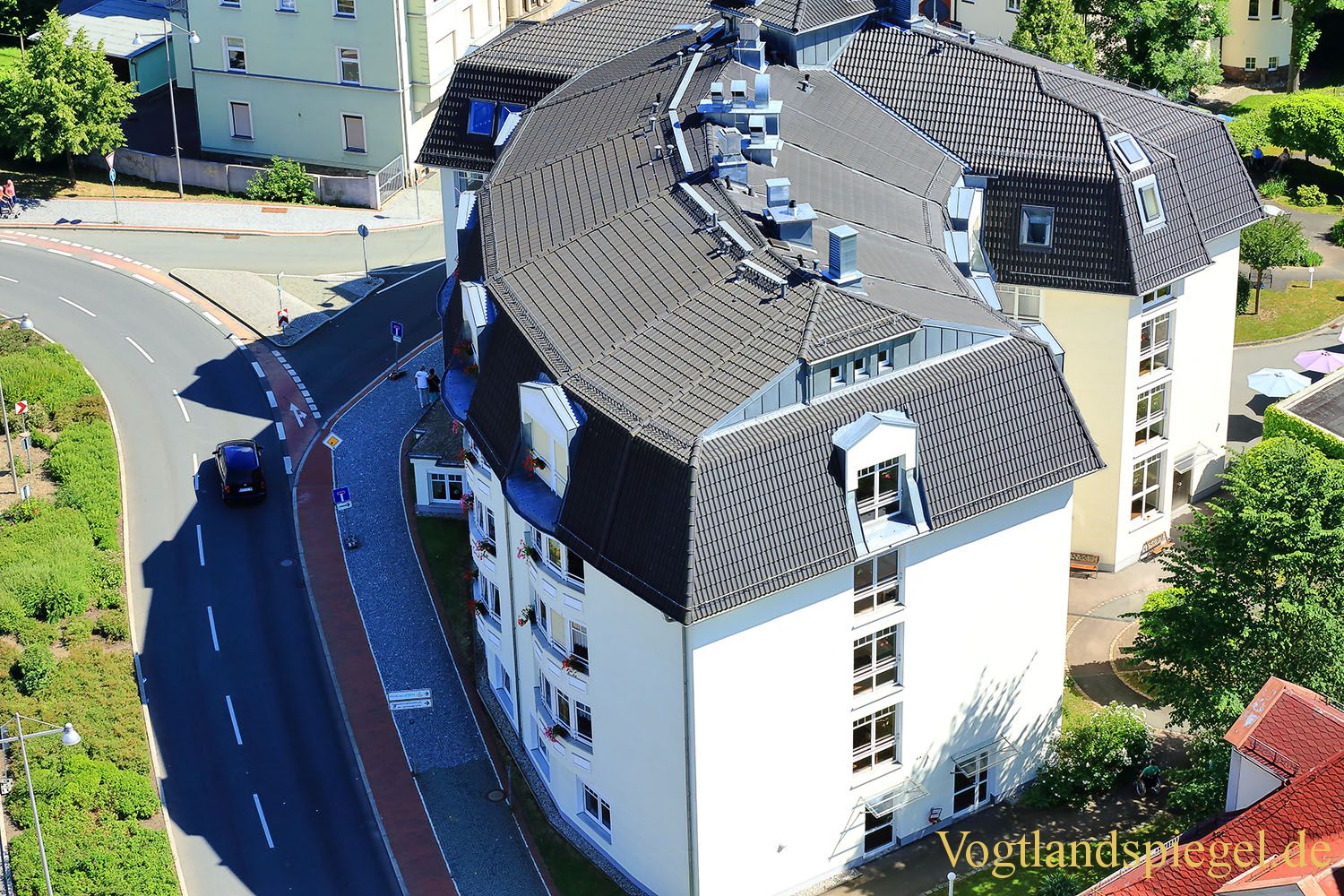 Blick aus der luftigen Höhe des Krankorbs auf die Stadt Greiz