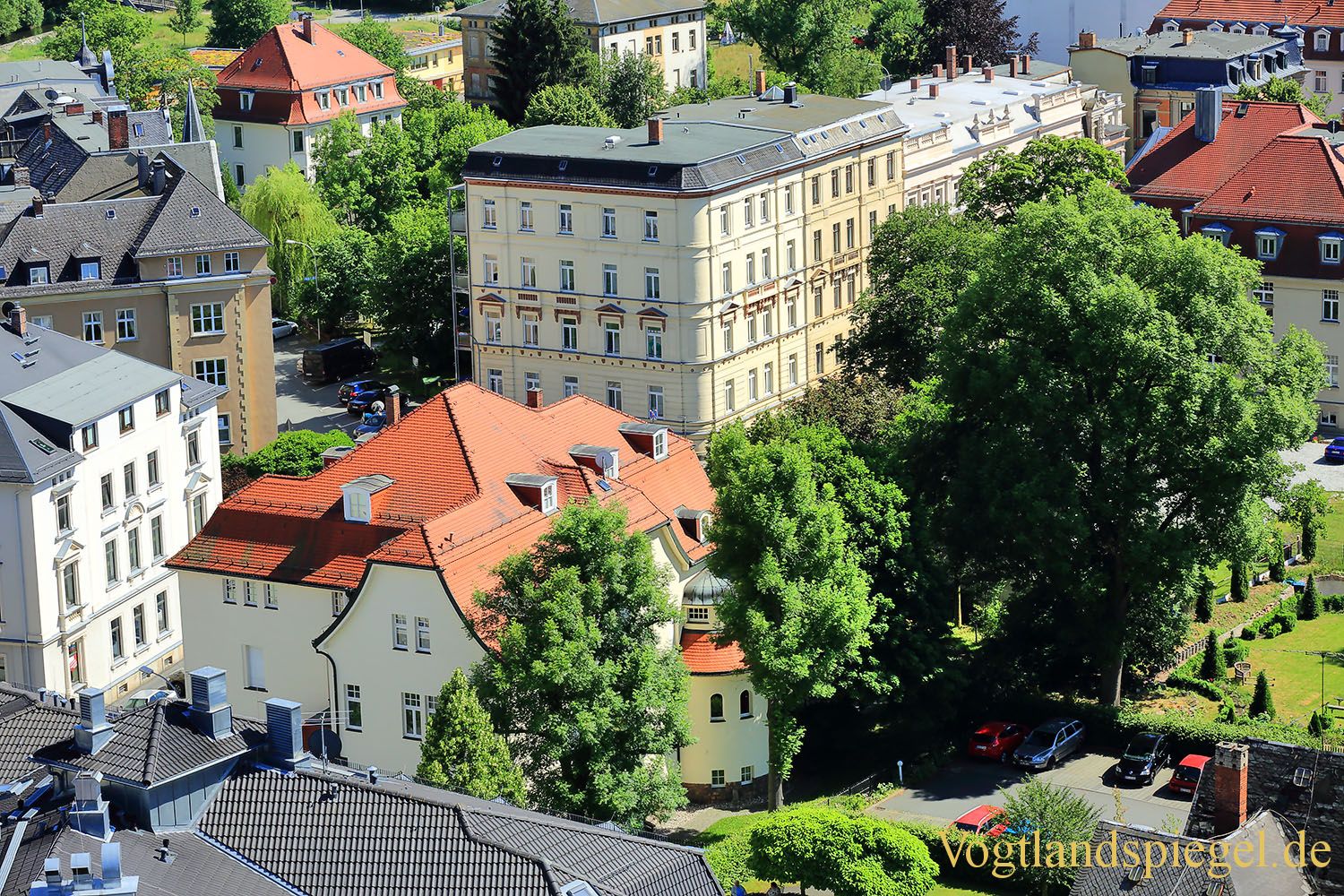 Blick aus der luftigen Höhe des Krankorbs auf die Stadt Greiz