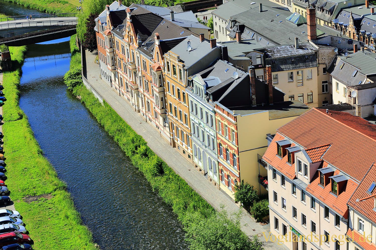 Blick aus der luftigen Höhe des Krankorbs auf die Stadt Greiz