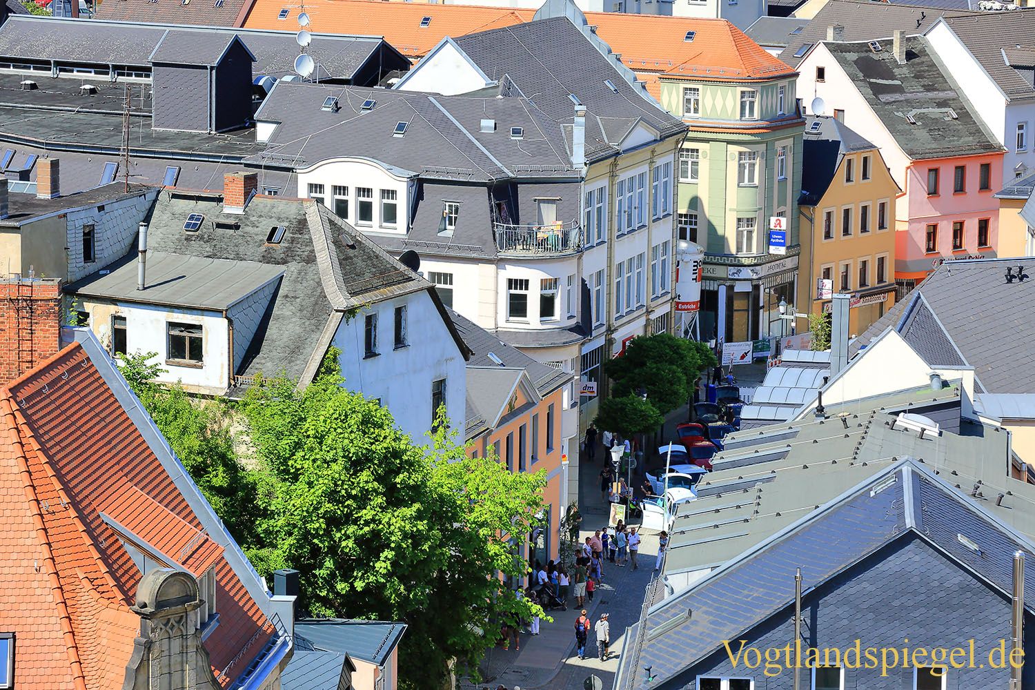 Blick aus der luftigen Höhe des Krankorbs auf die Stadt Greiz