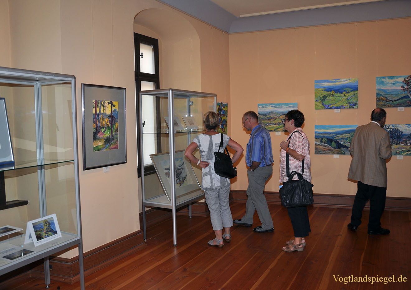 Interessiert betrachten die Gäste die Bilder der Ausstellung „“Blick ins Vogtland im Museum des Unteren Schlosses Greiz.