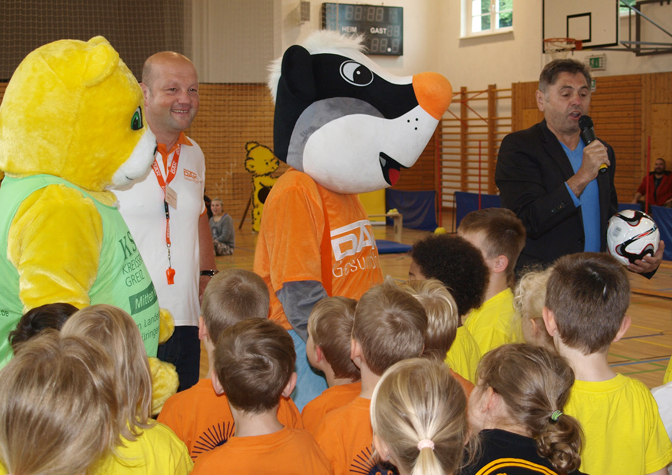 Bürgermeister Gerd Grüner (r.) zur Begrüßung der Kinder und Gäste des Bummi-Sportfestes.