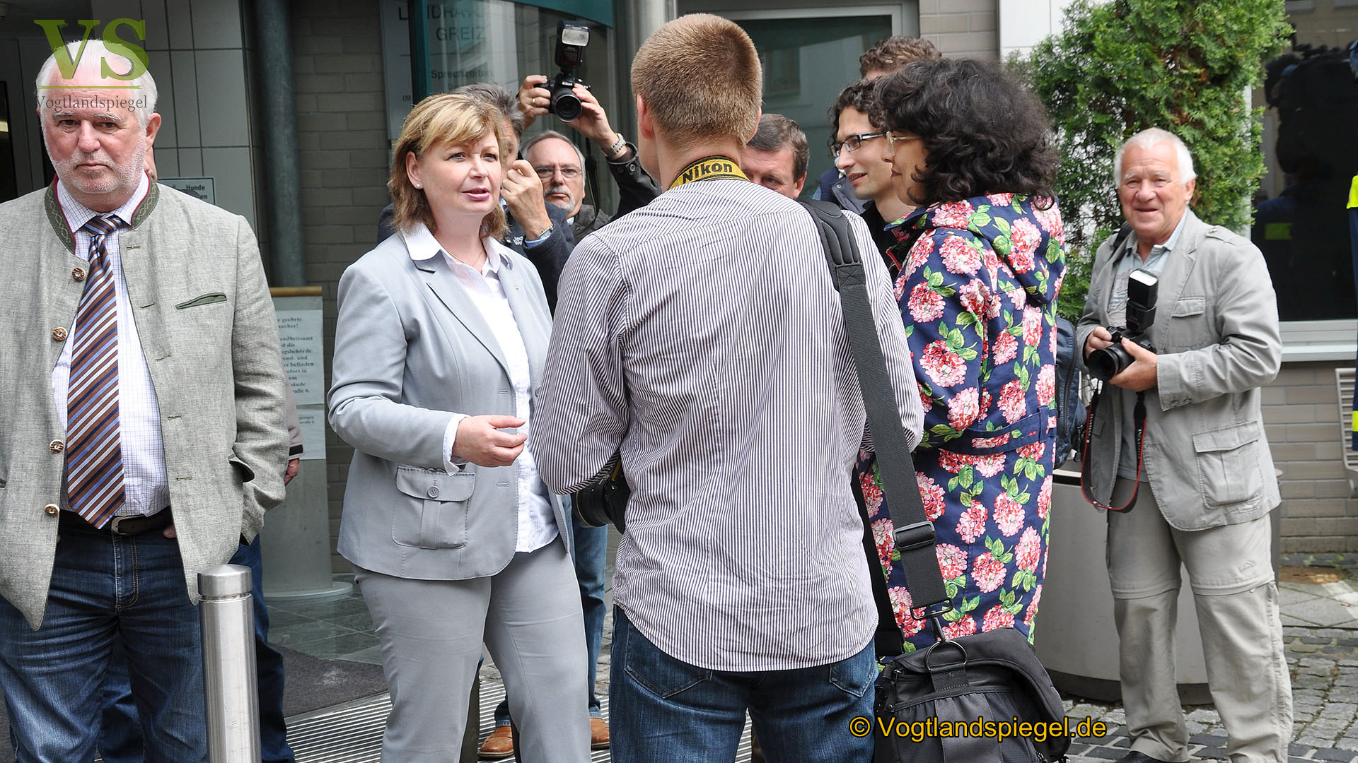 Zu einem spontanen Besuch in der Hochwasserregion kam am Dienstag Bundeskanzlerin Angela Merkel nach Greiz – auch Landrätin Martina Schweinsburg und Thüringens Wirtschaftsminister Jürgen Reinholz (l.) warten