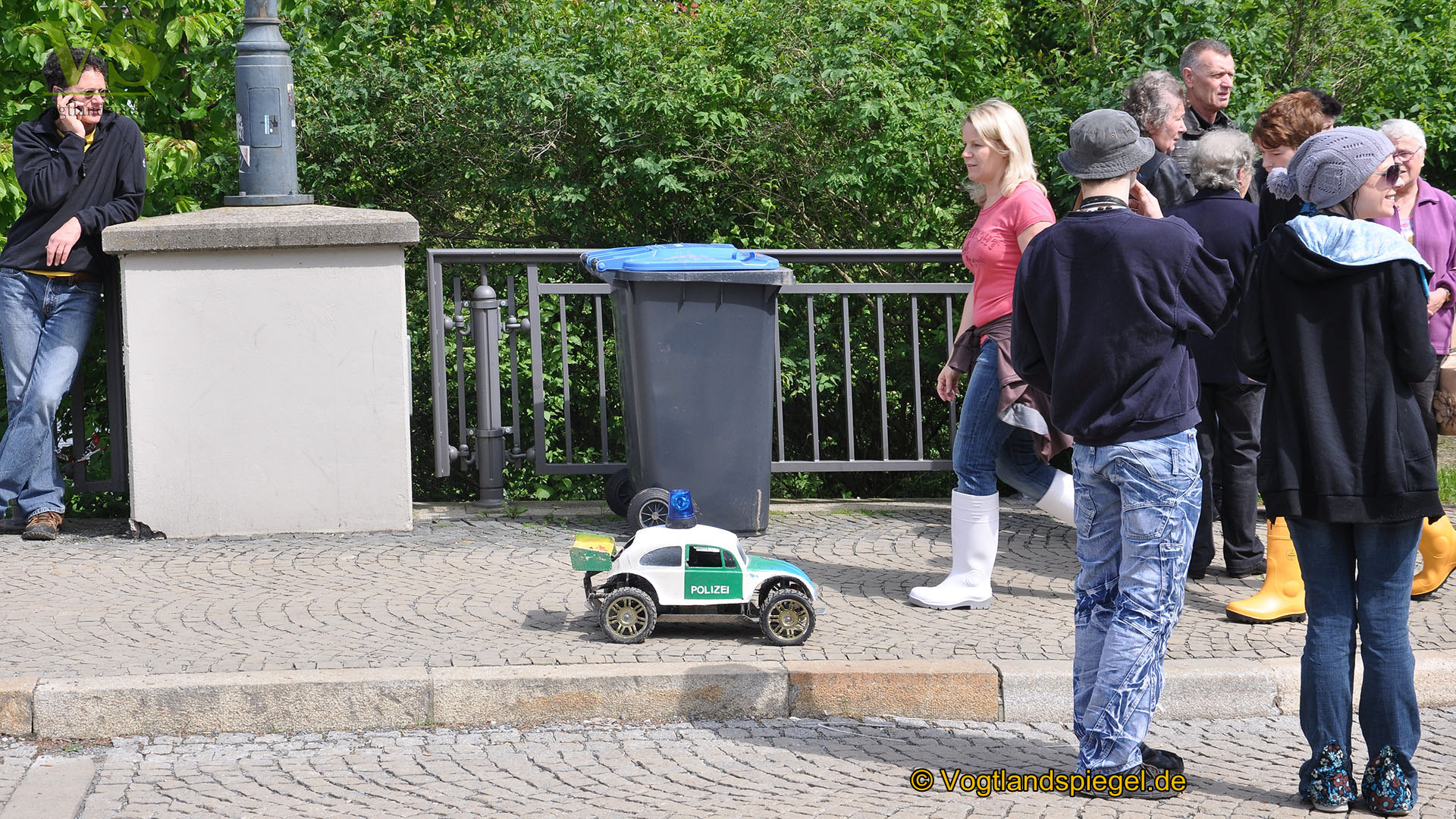 Zu einem spontanen Besuch in der Hochwasserregion kam am Dienstag Bundeskanzlerin Angela Merkel nach Greiz. -Polizeiauto en miniature