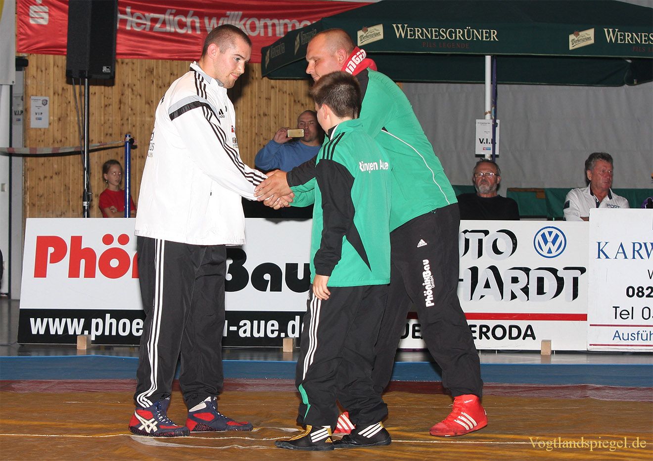 Lukasz Konera, RSV Rotation Greiz und Nico Schmidt, FC Erzgebirge Aue begrüßen sich herzlich, auch die Jugend ist immer mit dabei.
