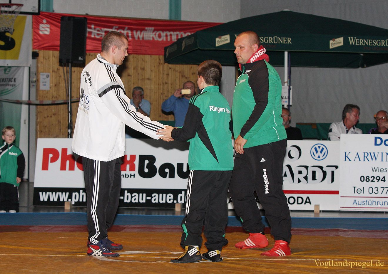 Lukasz Konera, RSV Rotation Greiz und Nico Schmidt, FC Erzgebirge Aue begrüßen sich herzlich, auch die Jugend ist immer mit dabei.