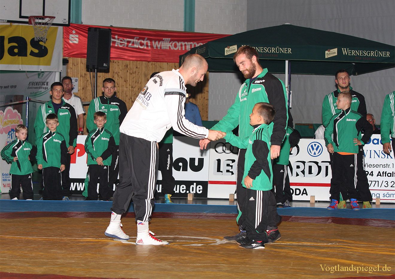 Thomas Leffler, RSV Rotation Greiz und Willi Wendel, FC Erzgebirge Aue begrüßen sich herzlich, auch die Jugend ist immer mit dabei.