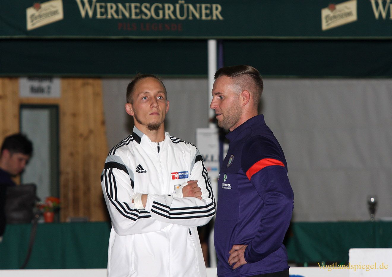 Sven Cammin, RSV Rotation Greiz und Trainer Björn Schöniger, FC Erzgebirge Aue im Gespräch