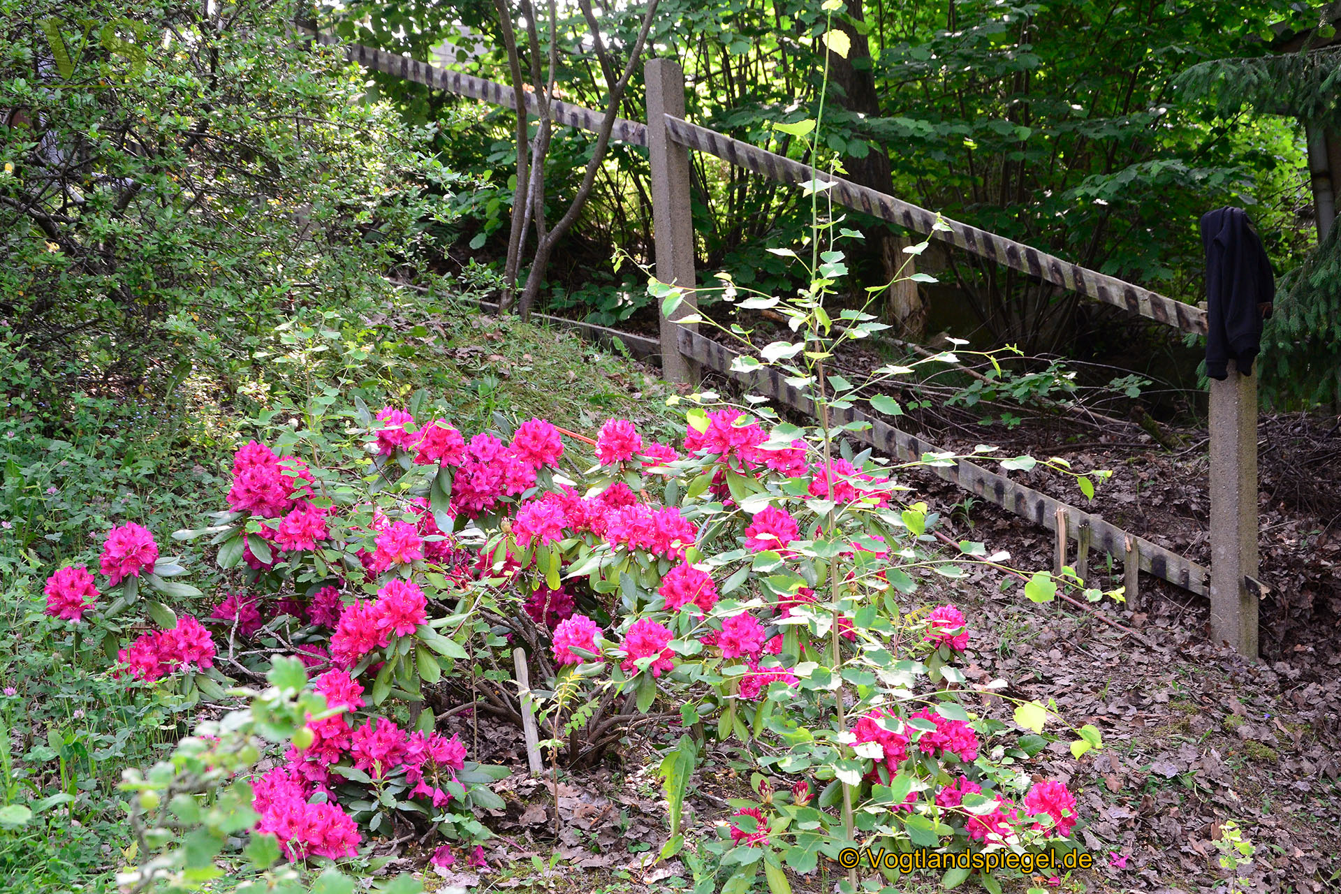 In den verwilderten Gärten blüht wunderschön der Rhododendron.