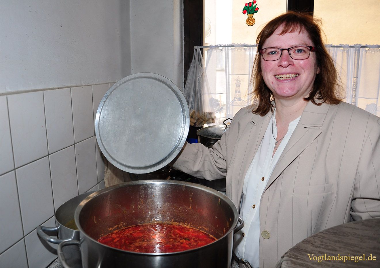 Ein Blick in den Kochtopf mit Borschtsch, aus dem es gut duftet.