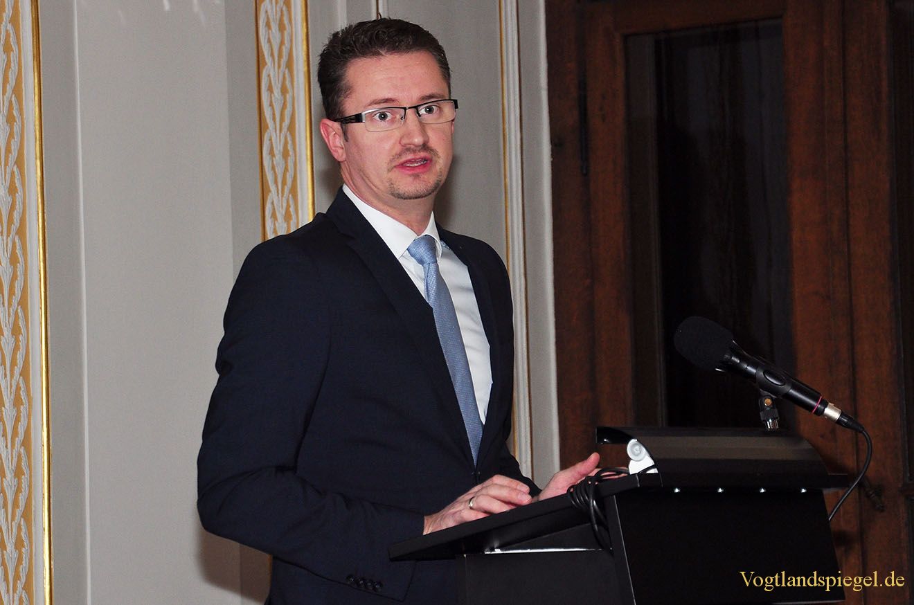 KSB-Vorstandsmitglied Christian Tischner begrüßt die Gäste der Veranstaltung im Weißen Saal des Unteren Schlosses.