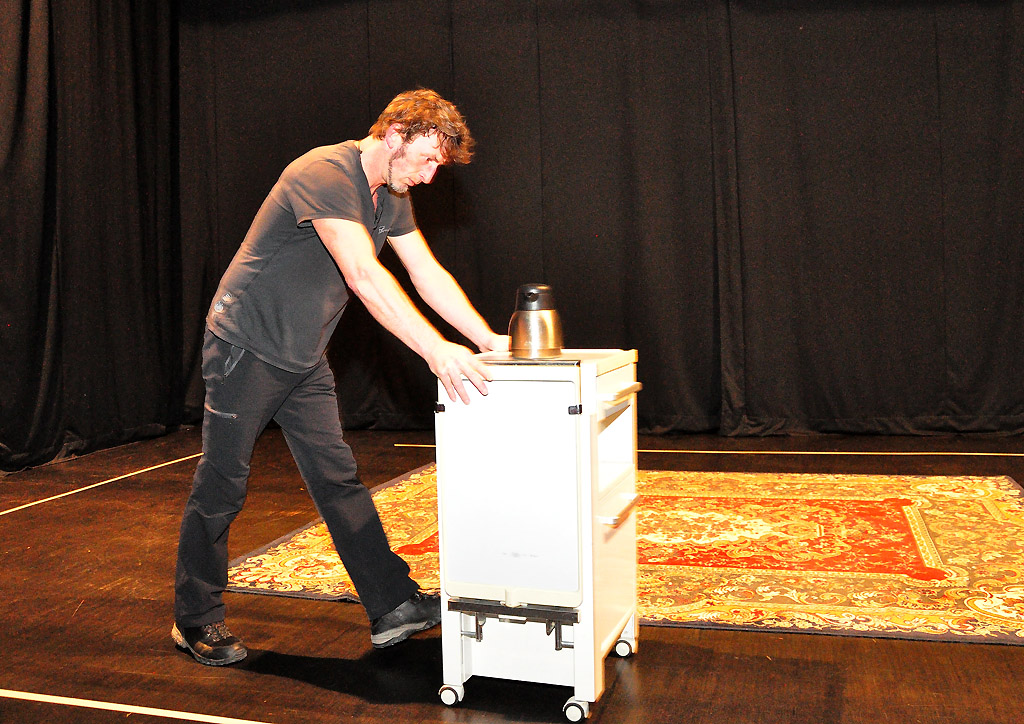 Techniker Jörg Flessa schiebt für die Bühnendekoration einen Nachttisch herein.