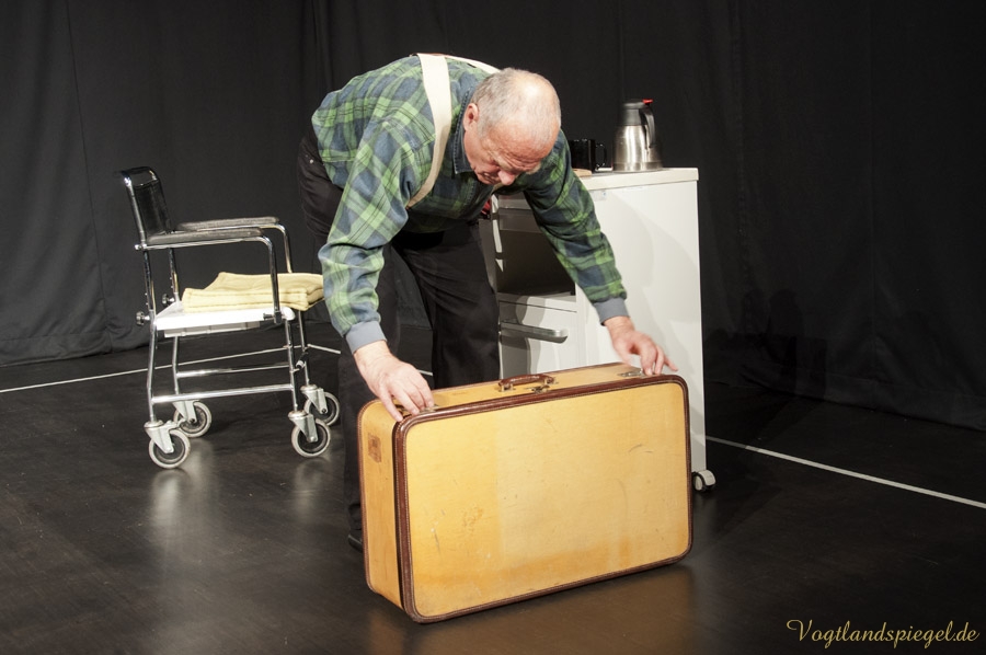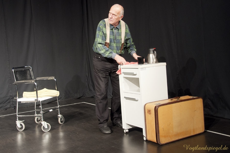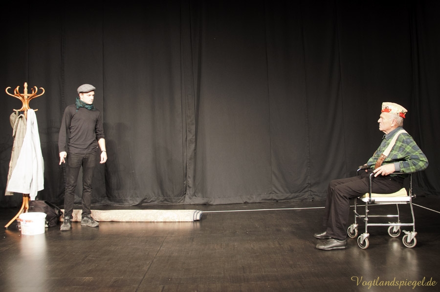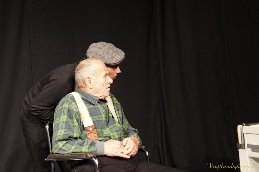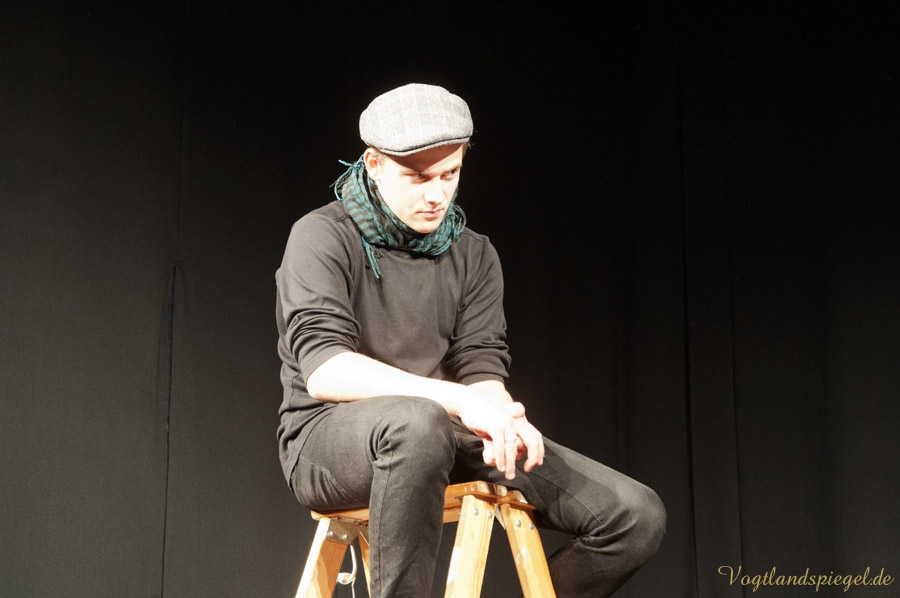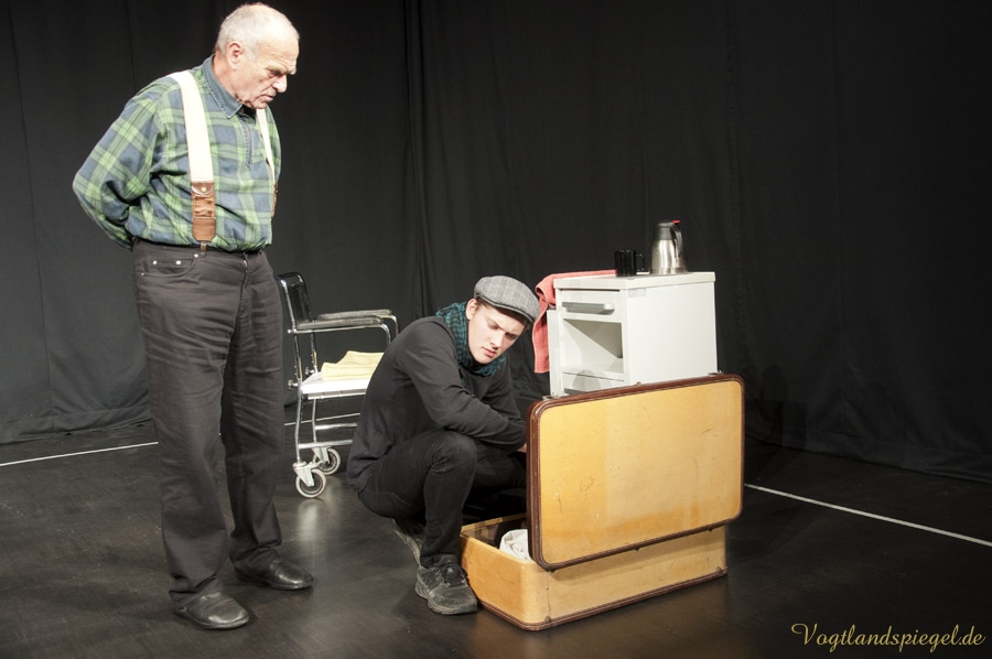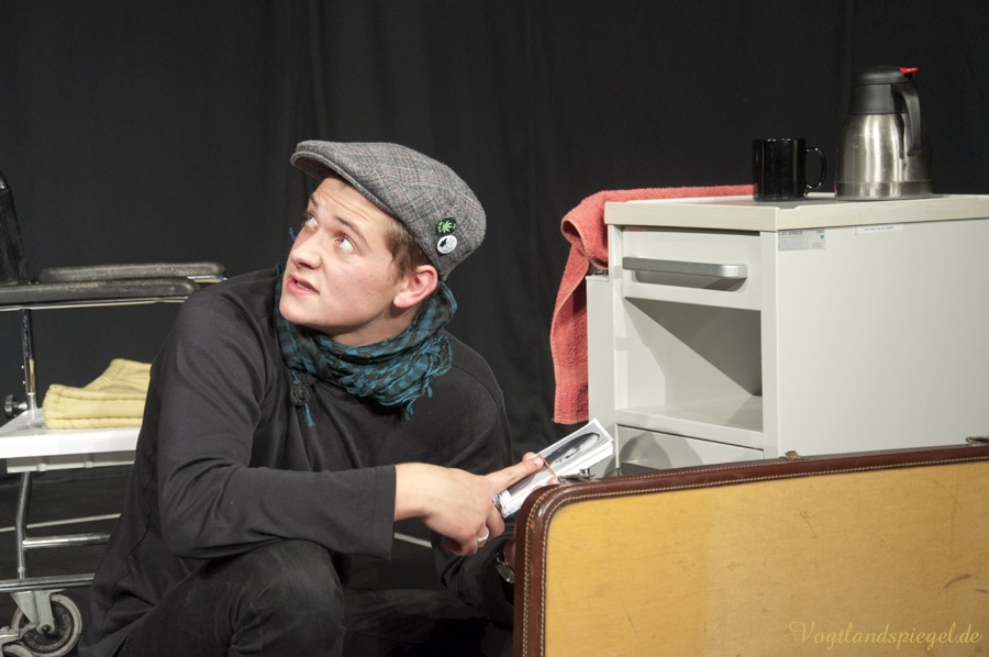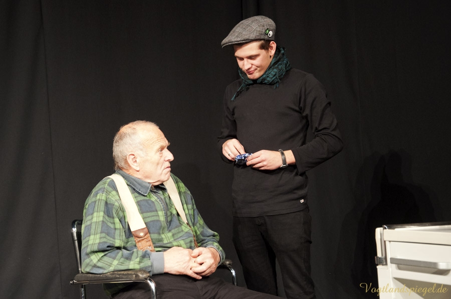 GREIZ. Der Aberglaube ist bei Schauspielern und Regisseuren gleichermaßen verbreitet. Toi, toi, toi zu wünschen – sich dafür aber nicht zu bedanken, gehört wie das dreimalige Spucken über die linke Schulter im Theaterleben zu den festen Gepflogenheiten, einer Premiere die besten Wünsche vorauszuschicken. Am Donnerstagabend fand auf der Studiobühne der Vogtlandhalle die Generalprobe für das Lutz-Hübner-Stück „Das Herz eines Boxers“ mit Wilfried Pucher (Regie und Rolle des Leo) und Sascha Weidhaas als Jojo statt. Mit der ersten Szene, als Undine Adler mit ihrem Akkordeon spielend vom oberen Foyer zur Studiobühne läuft, diese betritt, sich verbeugt, das Instrument abstellt, plötzlich hinter der Bühne Akkordeonmusik hört, die Hände in die Hüften stützt, genervt abwinkt und geht – zeigt sich Regisseur Wilfried Pucher noch nicht ganz einverstanden. „Es dauert zu lange, bis die Konserve einsetzt“ ruft er Jörg Flessa hinter der Bühne zu, der sich für die Technik verantwortlich zeichnet. Also, das Ganze nochmal! Nun zeigt sich Pucher zufrieden und das Stück kann anlaufen. Die beiden Mimen spielen es durch, ohne, dass es noch einmal unterbrochen werden muss. Nicht einmal, als sich Sascha mit der scharfen Klinge des Messers unbeabsichtigt einen Schnitt beibringt und dieser zu bluten anfängt. Ganz Profi – der 16-Jährige lässt sich nichts anmerken; erst nach der Probe klärt er über das Missgeschick auf. Es ist sicher auch ein Aberglaube, dass eine gelungene Generalprobe nicht ideal für die Premiere ist, doch das glaubt an diesem Abend sowieso keiner. Allgemein bekannt dazu ist, dass eine pannenreiche Generalprobe als gutes Omen für die Premiere gilt und umgekehrt, eine perfekte Generalprobe die Schauspieler und den Regisseur argwöhnen lässt, was für schreckliche Dinge am nächsten Abend passieren werden.