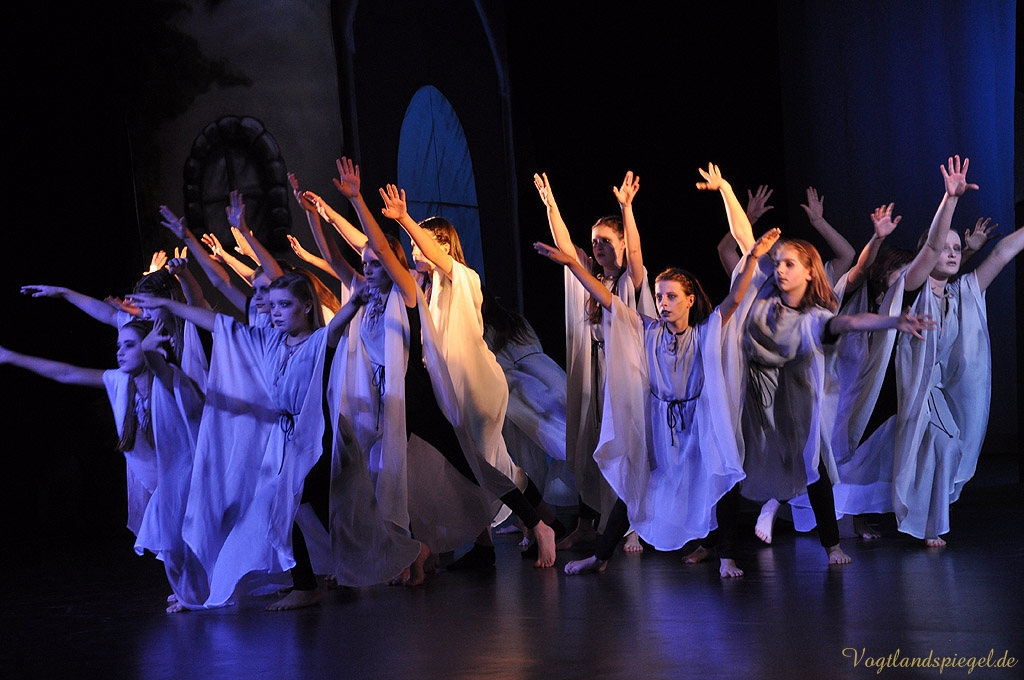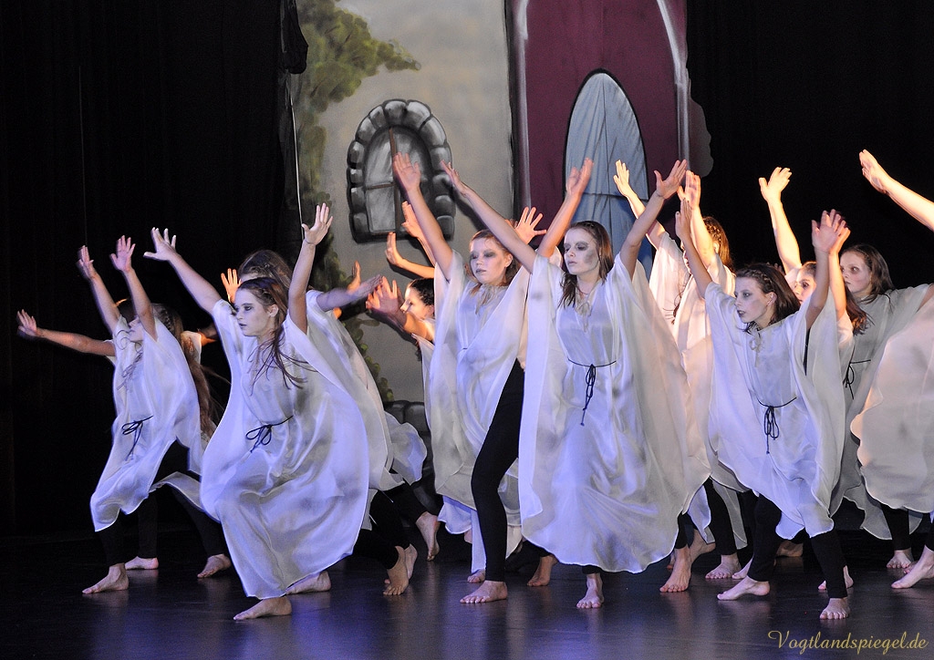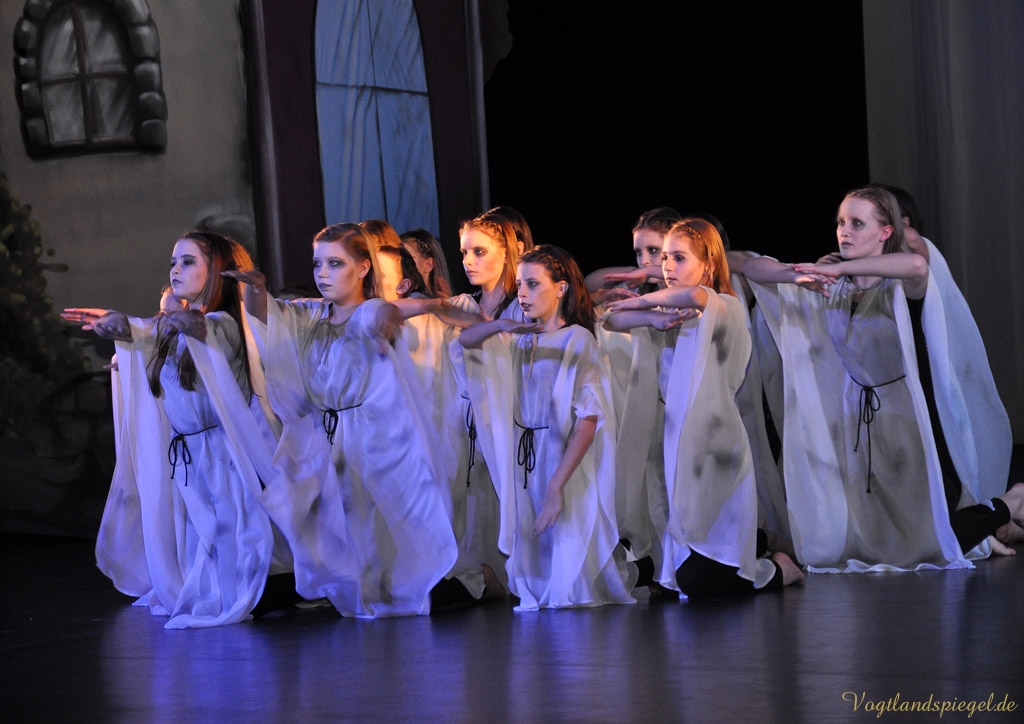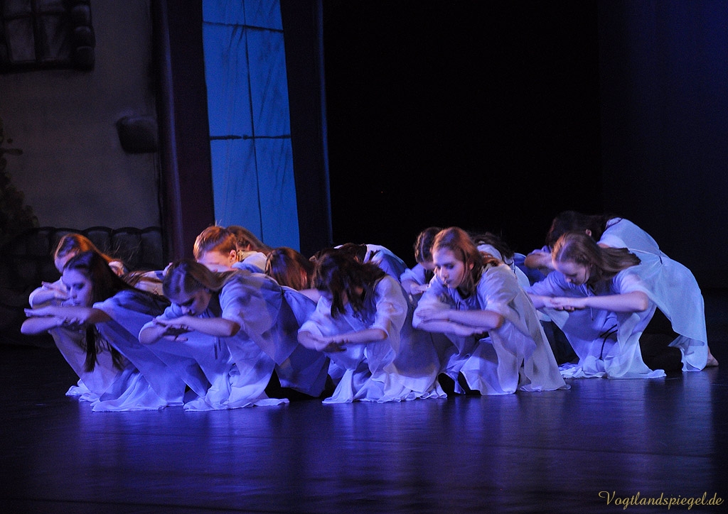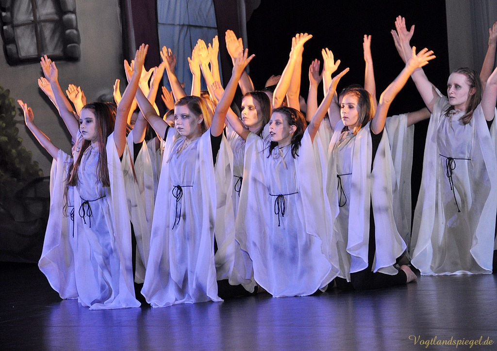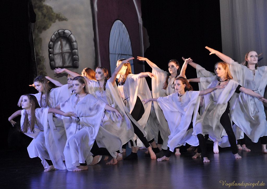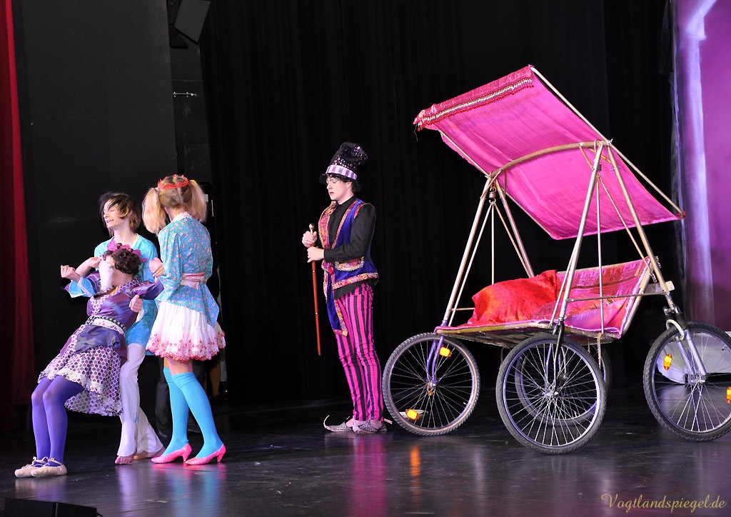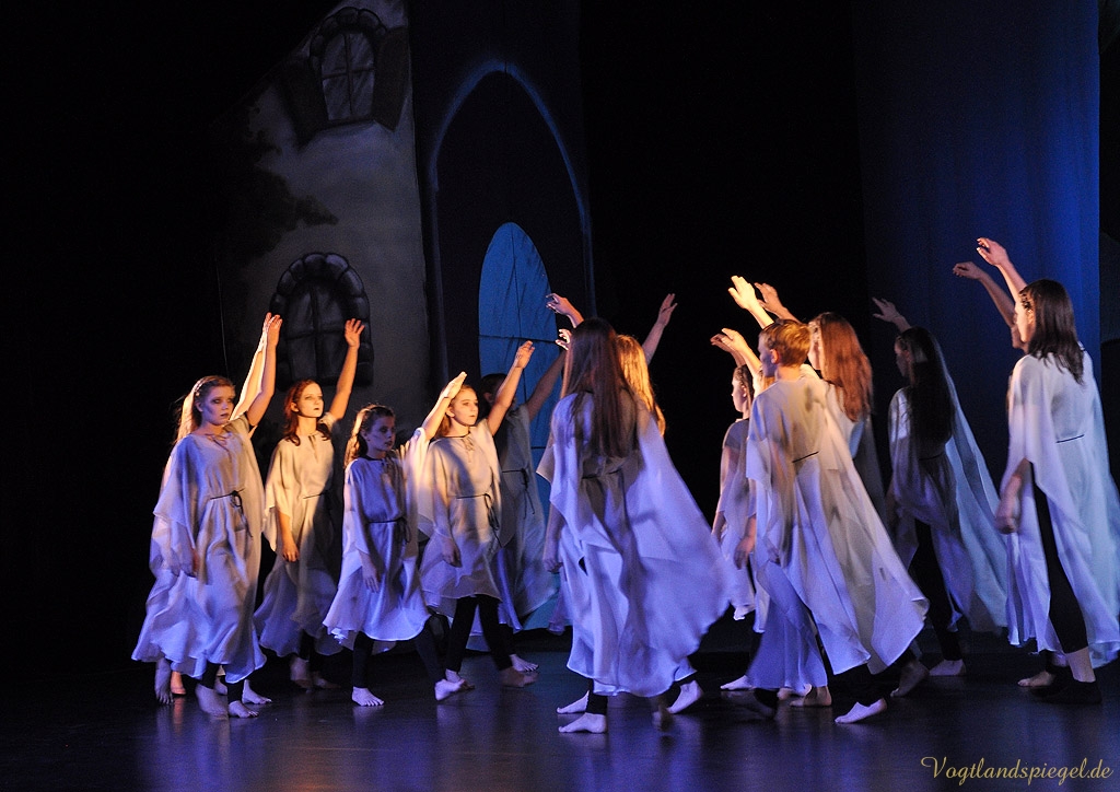 Soweit zur Handlung im Original. In Anke Hartmanns Weihnachtsmärchen läuft natürlich alles ein wenig anders. Vor allem lustiger. Der Harlekin (Sascha Weidhaas) und ein kleiner Igel begleiten das Glückskind Jakob (Til Hartmann) durch alle Gefahren. Alles begann mit einer Wahrsagung, so der Harlekin zu Beginn des Stückes, das von Anfang an die vor allem kleinen Theaterbesucher fest in seinen Bann zog. Die Jugendlichen der Tanzklassen der Kreismusikschule Bernhard Stavenhagen konnten einmal mehr mit ihren wunderschönen Tänzen in der Choreografie von Genadij Skorobogatovas begeistern, etwa beim Tanz der Teufelinnen. Amüsant auch die ganz in grün gekleideten schrill kreischenden Räuberinnen mit ihrer Anführerin Agatha (Anne Münzner) oder die schrecklich leckere Suppe, die Jakob gemeinsam mit der Großmutter des Teufels (herrlich komisch: Stephan Marek) kochte. Die Zutaten sollte man sich merken: eine Ratte, Geierbrühe, Schwefel und eine Prise Autoabgaskondensat€€¦Spaßig auch, wie sich Jakob, in Frauenkleider gehüllt, den liebestollen Teufel (urputzig: Jörg Flessa) vom Leib hält und schließlich überlistet.