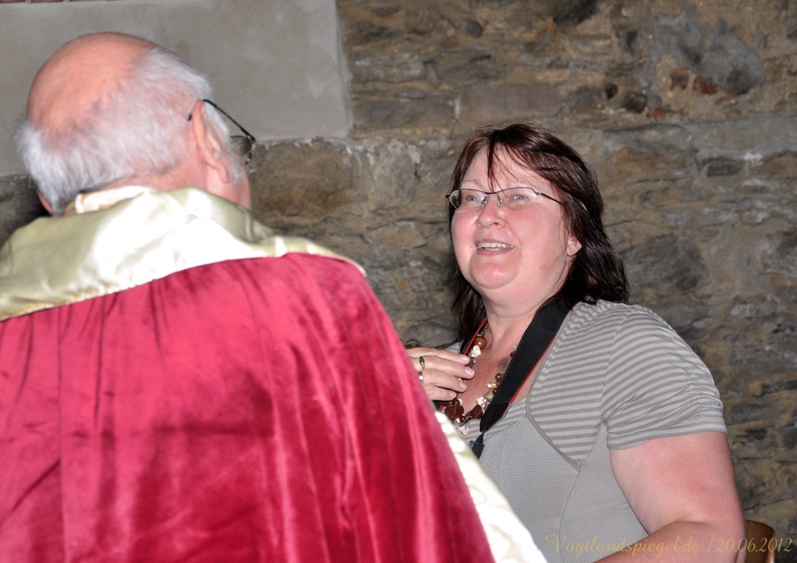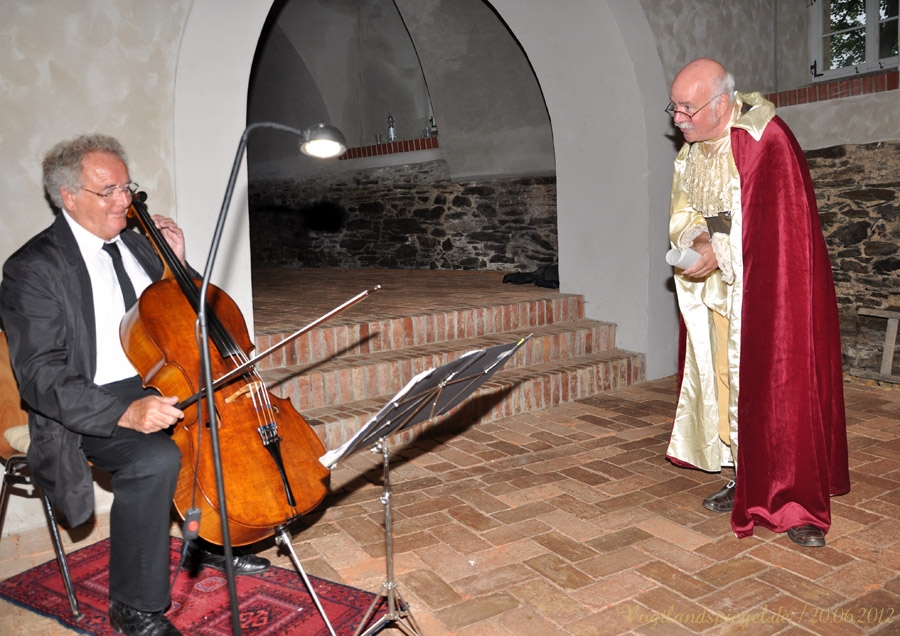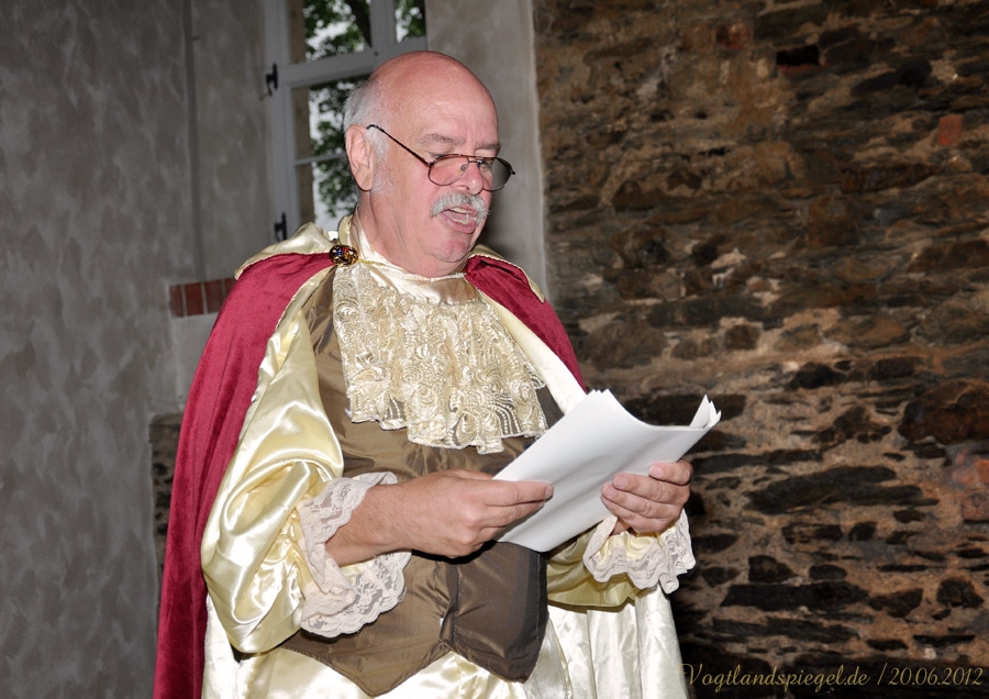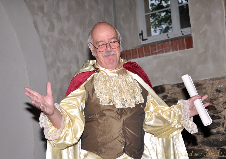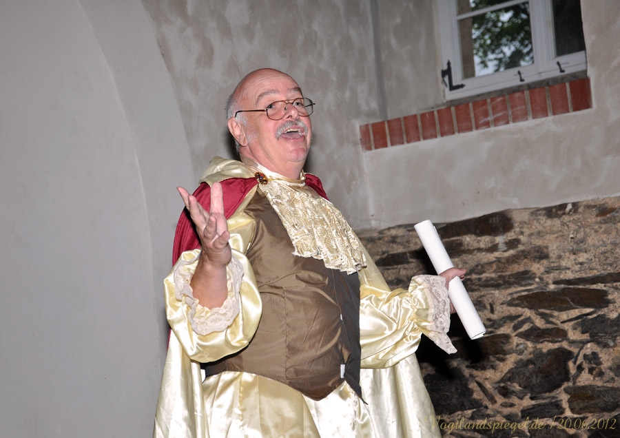 äugeln, liebeln, plänkeln Kammerjunker Melchior von Stollberg plaudert über „Allerley liebreitzende item boshafte Frauenzimmer bei Hofe Bernd Kemter alias Kammerjunker Melchior von Stollberg spricht über Amüsantes bei Hofe.GREIZ. Wenn Jürgen Frantz Käsecremehäppchen mit Knoblauch und Uwe Borchardt deftige Fettbrote feilbieten und Ines Wartenberg Rotwein ausschenkt, dann zeugt das von Aktivitäten des Fördervereins Oberes Schloss Greiz. Am Mittwochabend lud dieser zu einem höchst vergnüglichen geschichtlichen Streifzug in den Pferdestall des Oberen Schlosses ein: Kammerjunker Melchior von Stollberg alias Journalist und Autor Bernd Kemter und sein musikalisches Pendant, der Cellist Cornelius Herrmann aus Gera, Reuß Jüngere Linie entführten die gut 50 Zuhörer in die Goethezeit, als der Dichterfürst noch höchstpersönlich für Gesprächsstoff sorgte. Etwa durch die Beziehung mit Charlotte von Stein, der Kammerdienerin von Herzogin Anna Amalia. Melchior beschreibt sie als Persönlichkeit von Scharfsinn, kühler Reserviertheit, aber auch einem hohen Maß an Sensibilität. Friedrich Schiller sagte ihr sogar Nörgel-und Tadelsucht nach. Warum sie ihre Söhne Ernst, Karl und Fritz mit so unterschiedlicher Intensität liebte, vermochte der Insider-Kammerjunker nicht zu sagen. Auch über die kurioseste Ehe dieser Zeit am Hofe berichtete Melchior: Ein Sturm der Entrüstung sei damals in der Seelen-Essigfabrik ausgebrochen, als Carl Ludwig von Knebel ein Urfreund Goethes die 37 Jahre jüngere Luise von Rudorff, genannt schönes Rudelchen im zarten Alter von 17 Lenzen ehelichte. Doch allen Unkenrufen zum Trotz hielt diese Ehe, wie Melchior von Stollberg wissend berichtete. So sei aus dem lockeren Zeisig eine gute Ehefrau geworden. Eine gar wunderliche Plauderei gab der Erzähler über August von Einsiedel, Bruder eines Kammerdieners der Herzogin Anna Amalia und Intellektueller, der sich im Kreis Goethes bewegte, zum Besten: Lange Jahre hatte Einsiedel sein Verhältnis mit Emilie verw. von Werthern streng geheim gehalten. Gemeinsam mit der Geliebten hatte er deren Scheinbegräbnis in Leitzkau vorbereitet und durchgeführt, um schließlich mit ihr zu Forschungszwecken nach Tunis zu reisen. Im Sarg lag nur eine Puppe, wie Melchior berichtete. Es hieß, Emilie von Werthern, eine enge Freundin von Charlotte von Steins Schwester Sophie, sei plötzlich verstorben. In Wirklichkeit täuschte die verheiratete Frau ihren Tod vor und brannte mit ihrem Liebhaber nach Afrika durch. Drei Jahre später heiratete Einsiedel nach deren Scheidung Emilie. Melchior, der eine Lanze für die Ehe brach sie ist eine Kulturerrungenschaft unterhielt mit viel Augenzwinkern und Heiterkeit die Gäste der Veranstaltung. Kammermusicus Cornelius Herrmann musste dagegen einige Spitzen ertragen. Mit gefühlvollen Melodeien aus der Feder von Johann Sebastian Bach oder Georg Philipp Telemann, die allesamt von Melchior mit kritischem Ohr verfolgt wurden, verzauberte der Cellist mit sanften Tönen das Publikum. Obwohl Melchior die Vermutung äußerte, dass der Musicus mit diesem leidlichen Spiel nie den Sprung in die Weimarer Hofkapelle schaffe, muss erwähnt werden, dass Cornelius Herrmann viele Jahre lang im Mozarteum Orchester Salzburg als Solocellist tätig war. Antje-Gesine Marsch @20.06.2012
