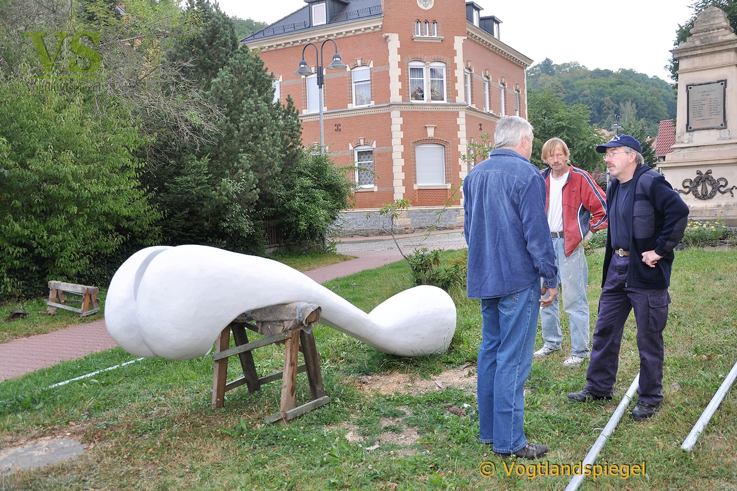 Vor dem Transport beraten sich die Helfer vor dem Bergaer Heimatmuseum