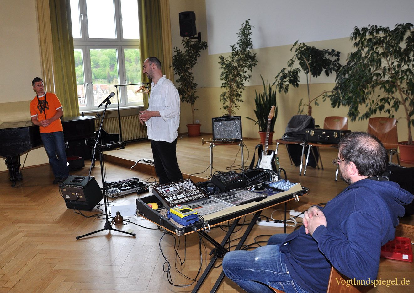 Jörg Piesendel, Ulrich Blumenstein und Christoph Beer stellen den Schülern Elektrikjazz vor.