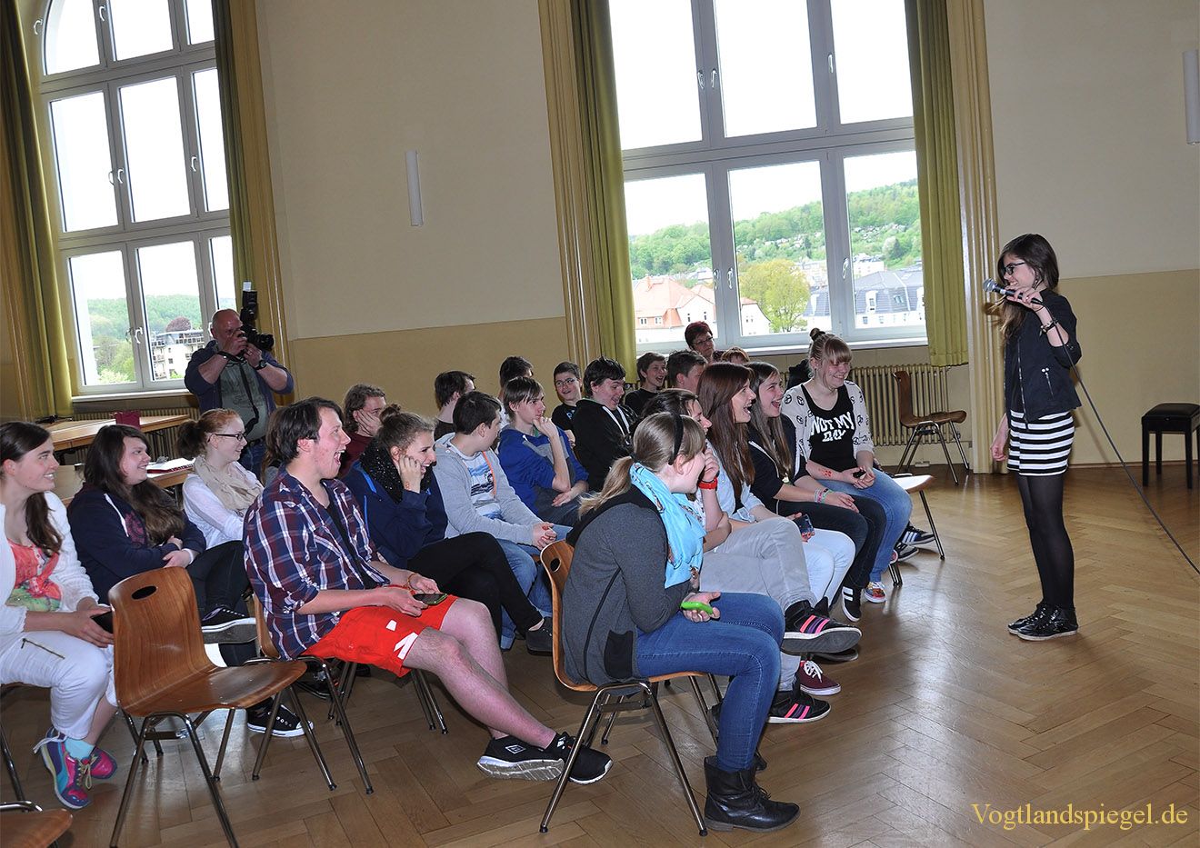 Linda (r.) hält das Mikrofon, während die Schüler laut schreien sollen.