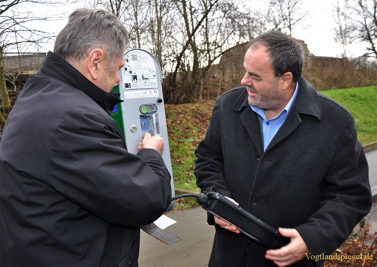Mario Walther (r.) und Bürgermeister Gerd Grüner schauen sich die Funktionsweise der Elektrotankstelle an.